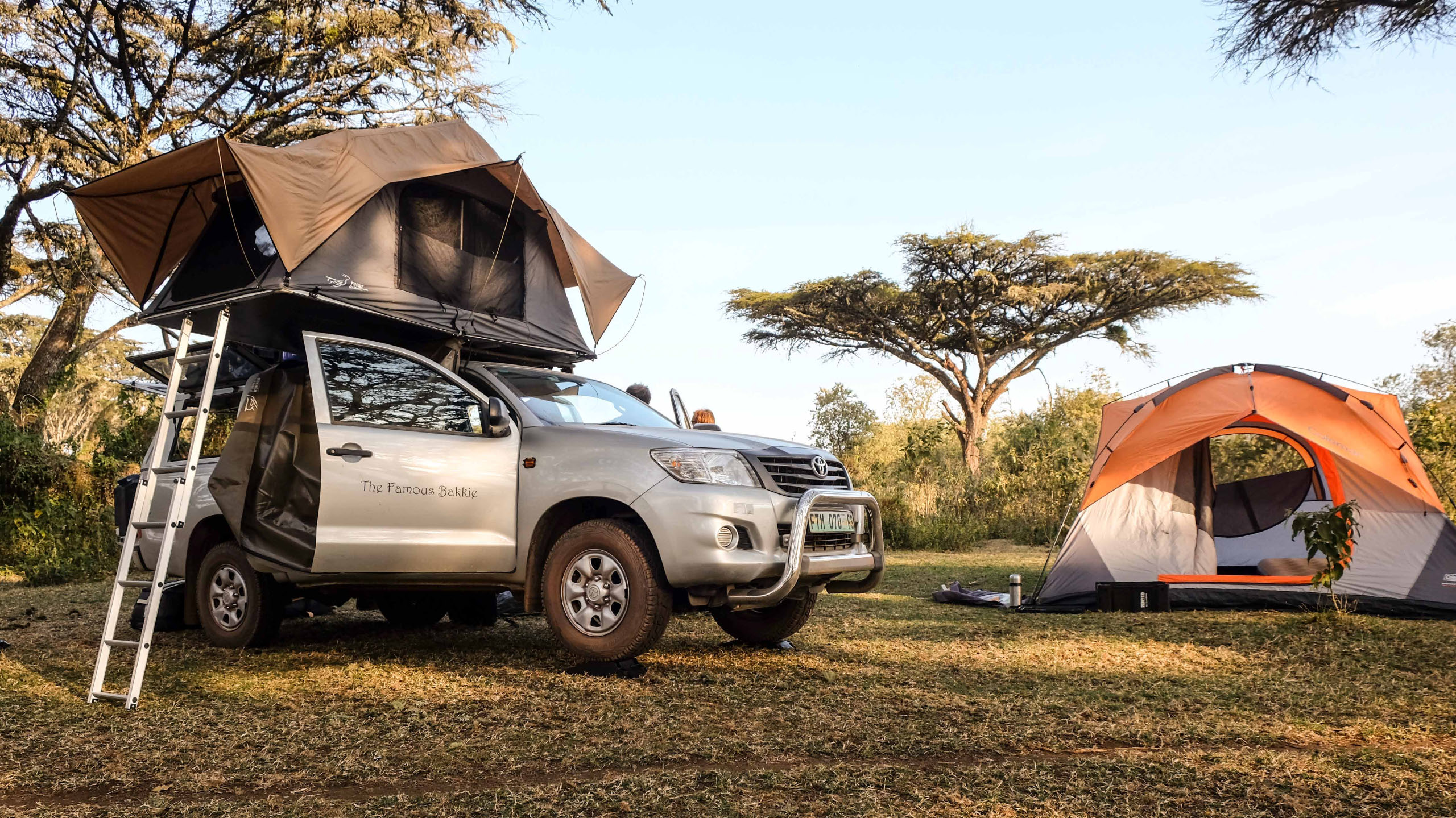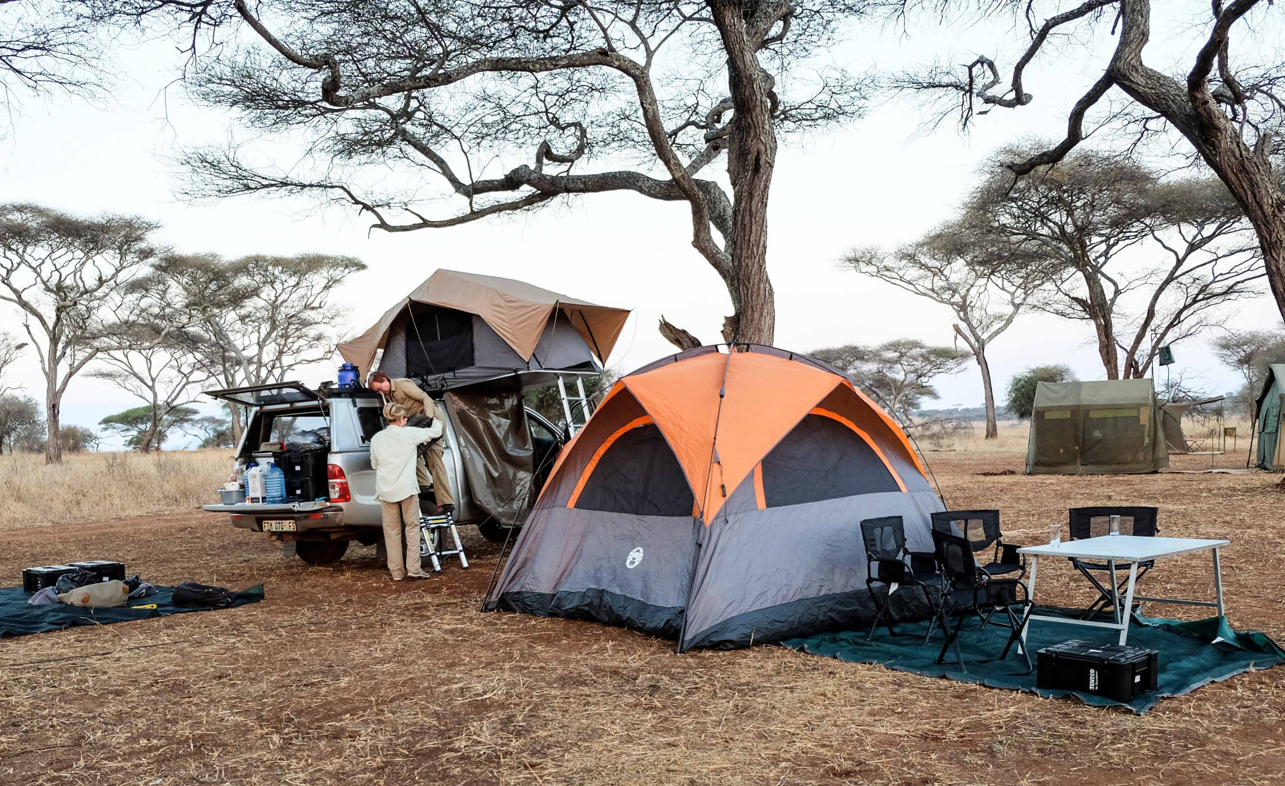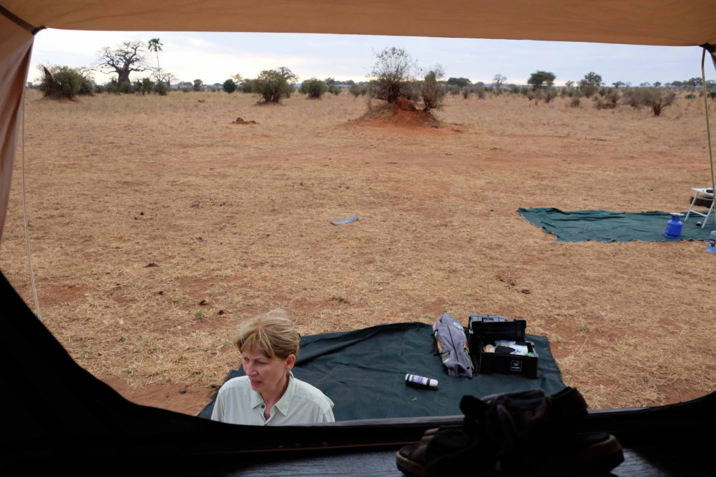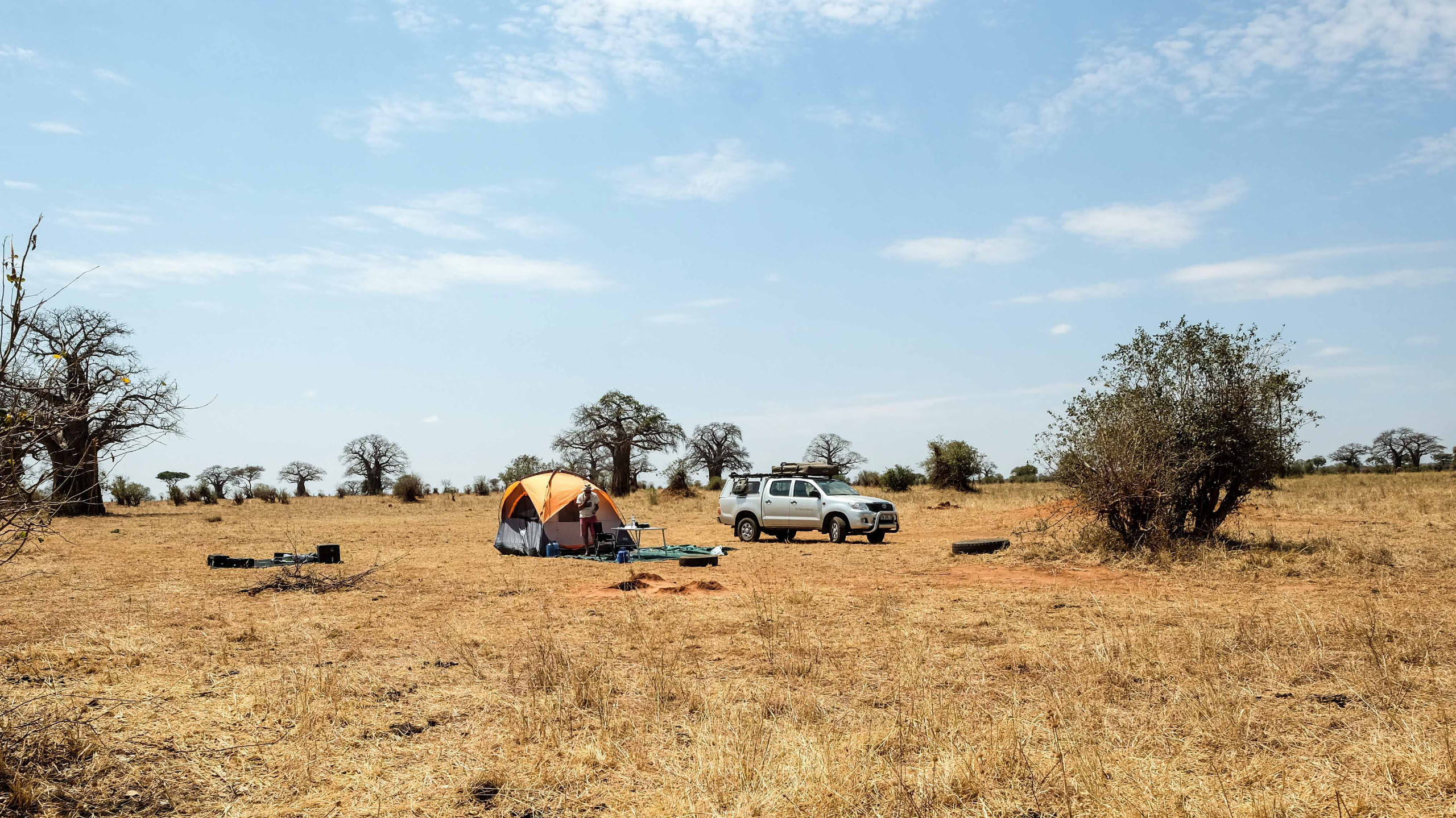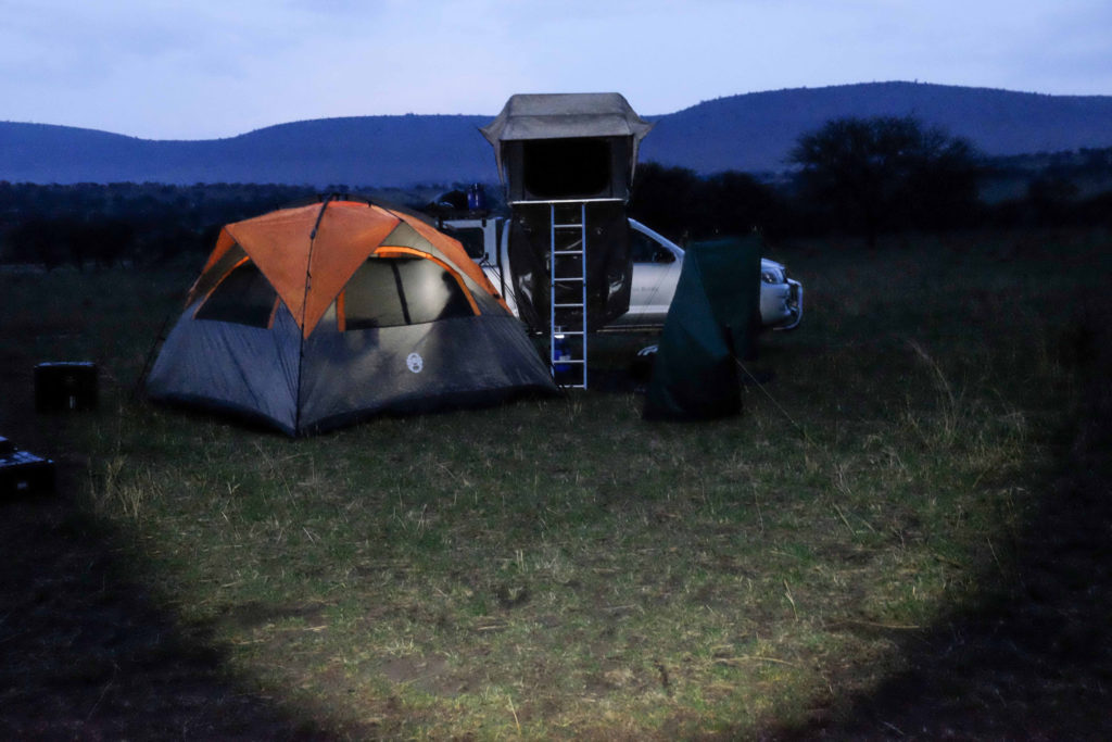 Auf der Special Campsite Hondohondo bauen wir die Zelte auf und suchen Feuerholz. Ein Feuer brauchen wir um Tiere von uns fern zu halten, schließlich sind wir mitten in der Wildnis. Specials Campsite heißt, wir sind alleine und haben weder Toiletten noch Duschen. Muss man auf die Toilette, nimmt man einfach einen Spaten mit, geduscht wird mit einer mobilen Dusche die an einem Baum oder einfach am Auto befestigt wird. Wir kochen mit einem Gaskocher. Pfadfinderfeeling kommt auf.
