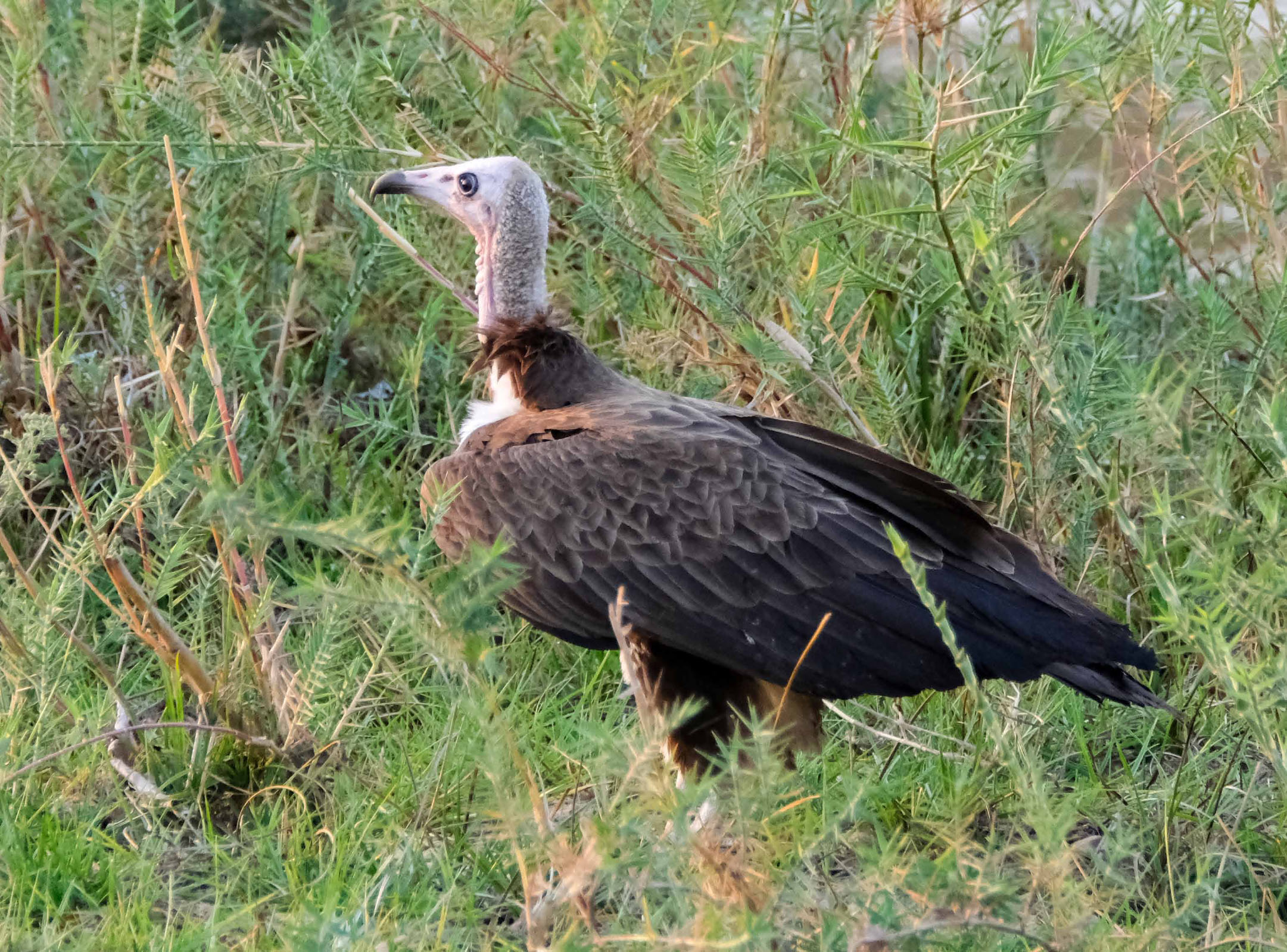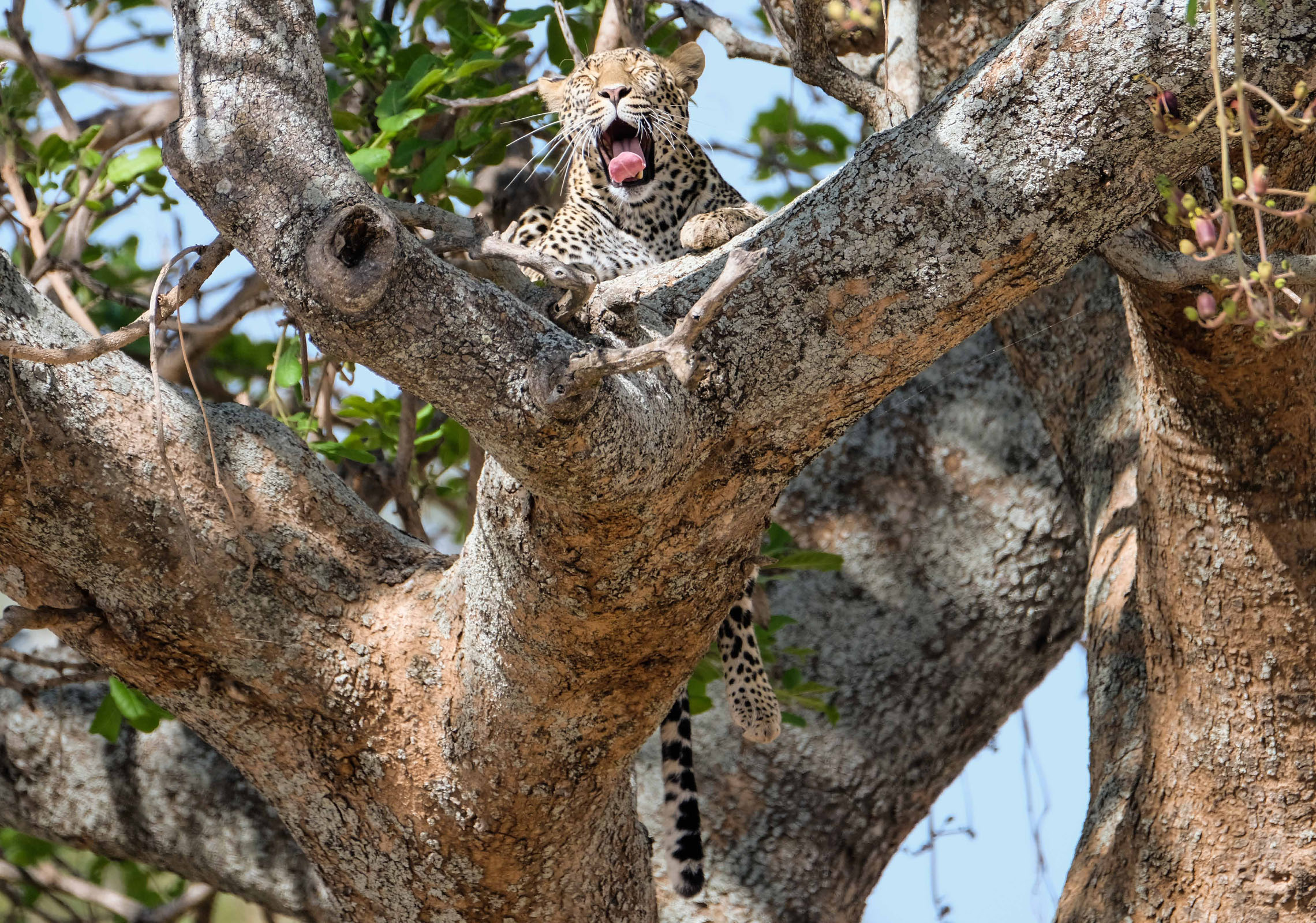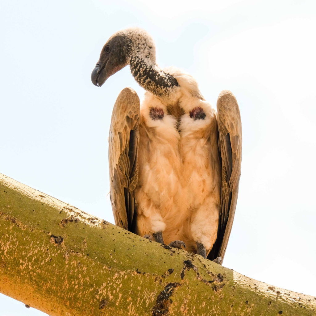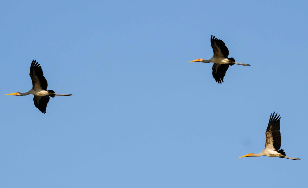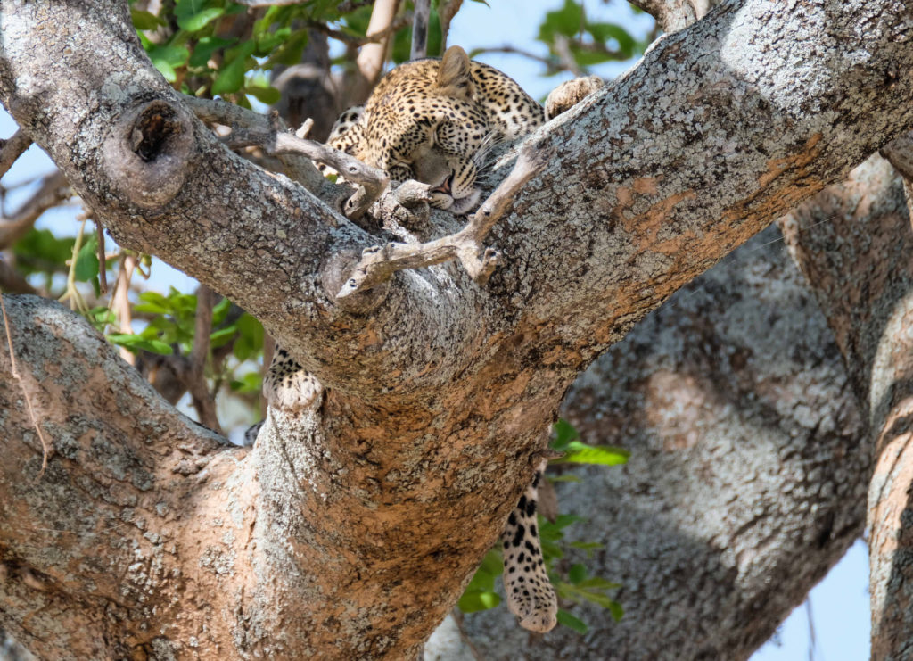 Schnell zurück zum Camp für ein kleines Frühstück, dann geht es weiter. Ein Rudel Löwen döst unter einem Baum. Marc kann mit seinem Landcruiser bis auf 15 m ranfahren. An einer anderen Stelle frisst eine Hyäne an Resten eines Büffels. Dutzende von Geiern sitzen auf Bäumen oder beteiligen sich an den Resten. Auf der Weiterfahrt sehen wir Kudus, Antilopen, Elefanten, Zebras, einen Sattelstorch und andere Vögel.