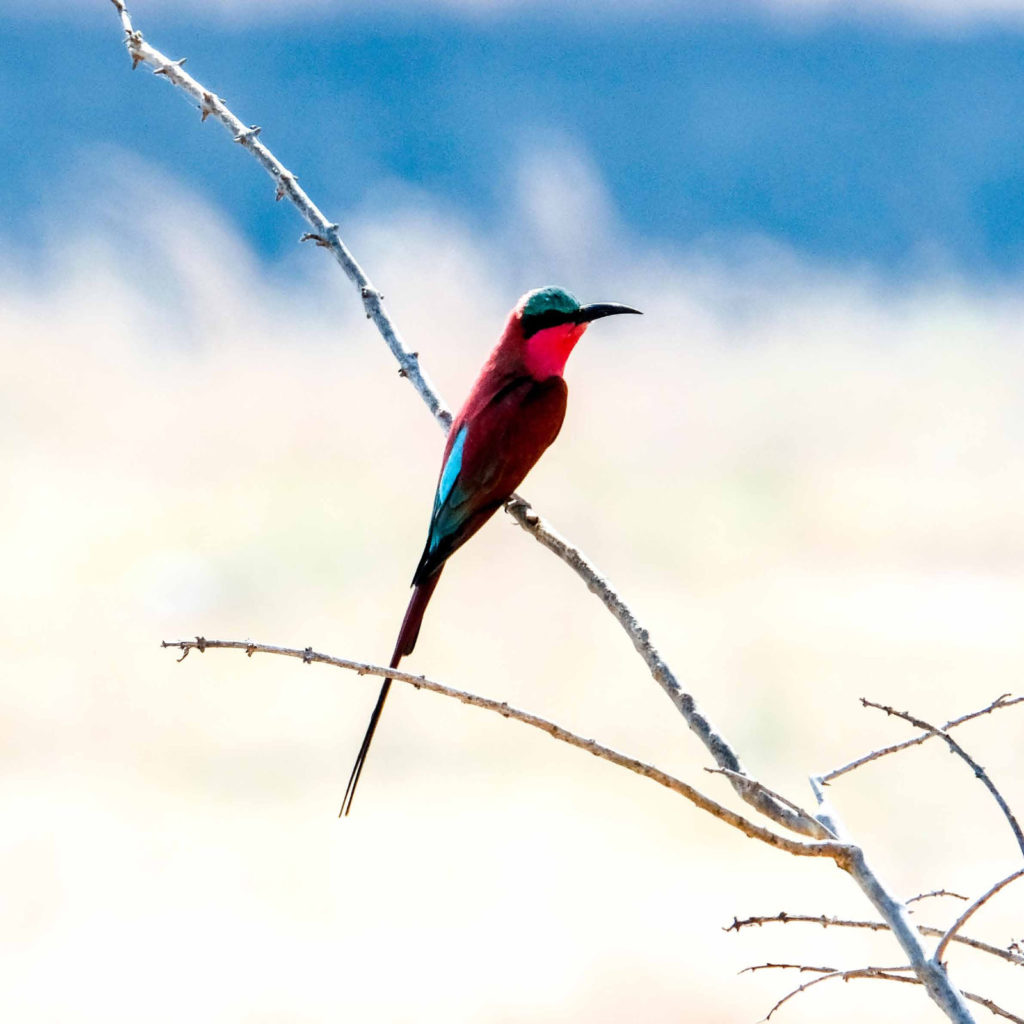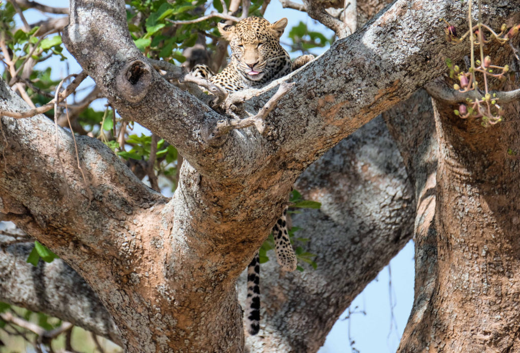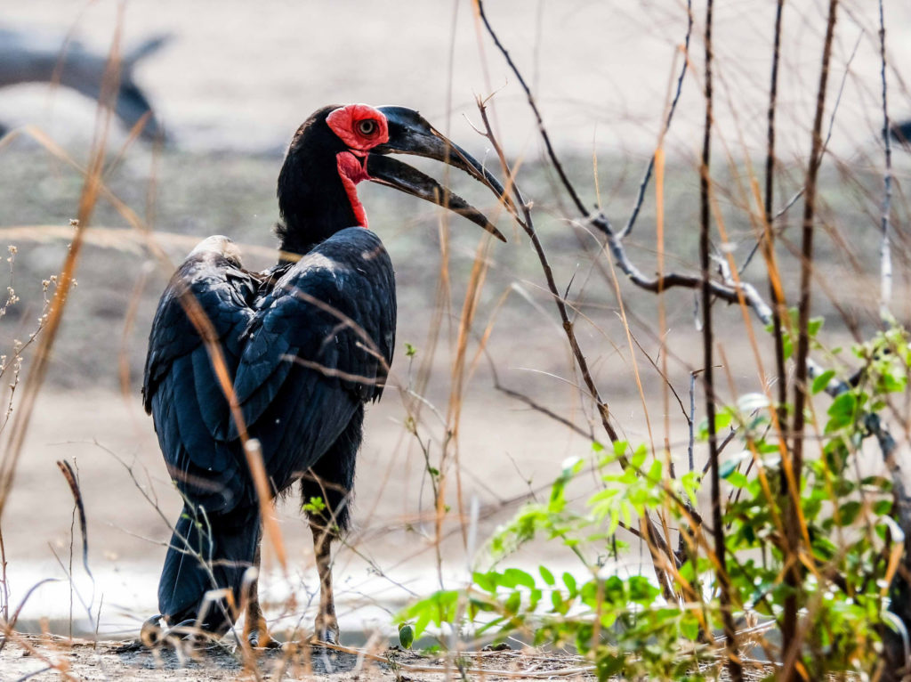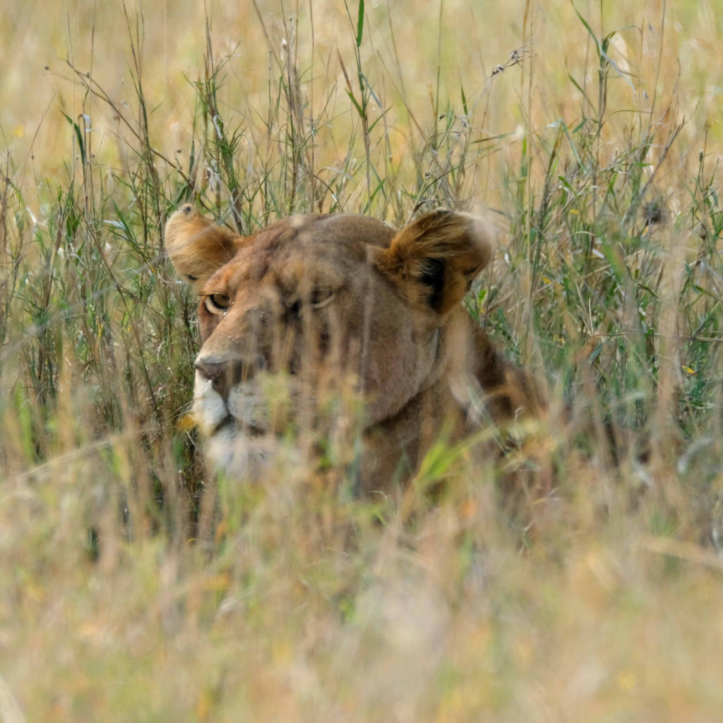 Unsere Game Drives sind einfach spektakulär. Wir sehen einen schlafenden Gepard am Wegesrand, zwei Löwen im hohen Gras, viele Elefanten, Büffelherden, Gnus, Dikdiks, Mangos, einen schlafenden Leoparden in einem Johannesbeerbaum, Strauße mit einem rosa Hals, was bedeutet, dass sie auf Brautschau sind, verschiedene Vögel, wie zum Beispiel Geier oder Kaffernhornraben.