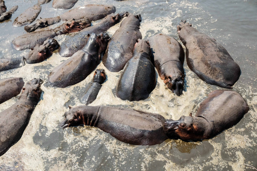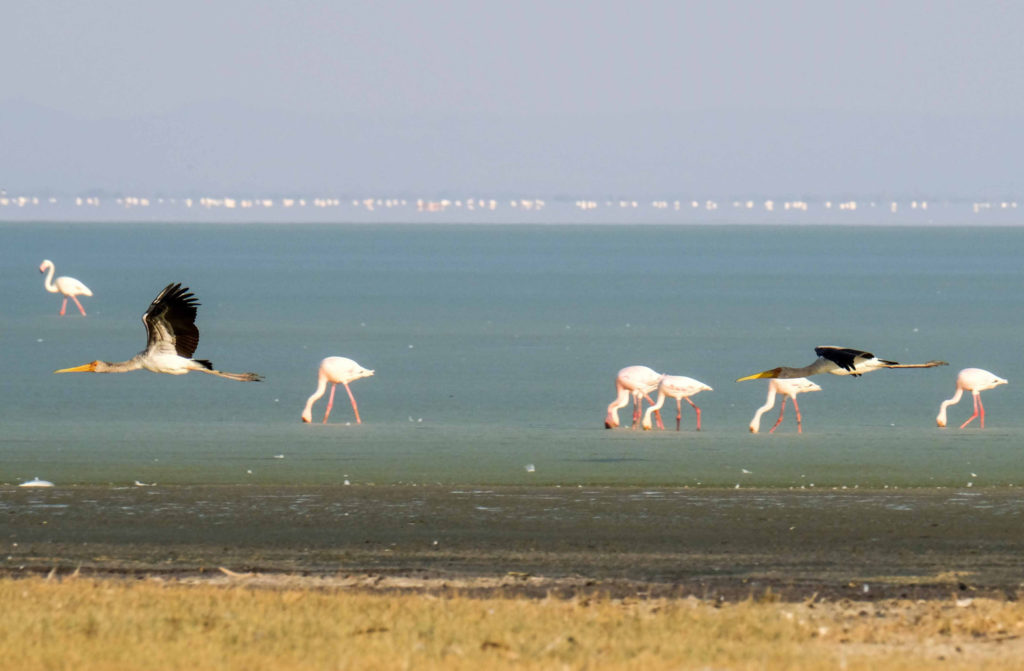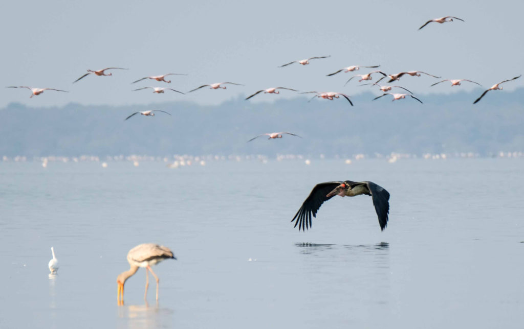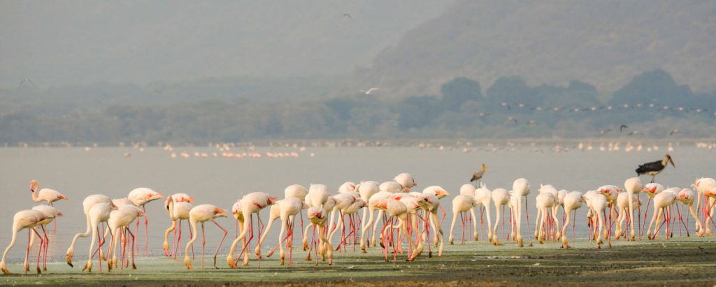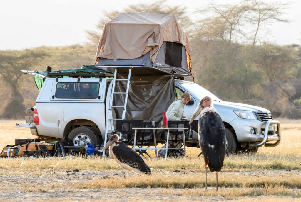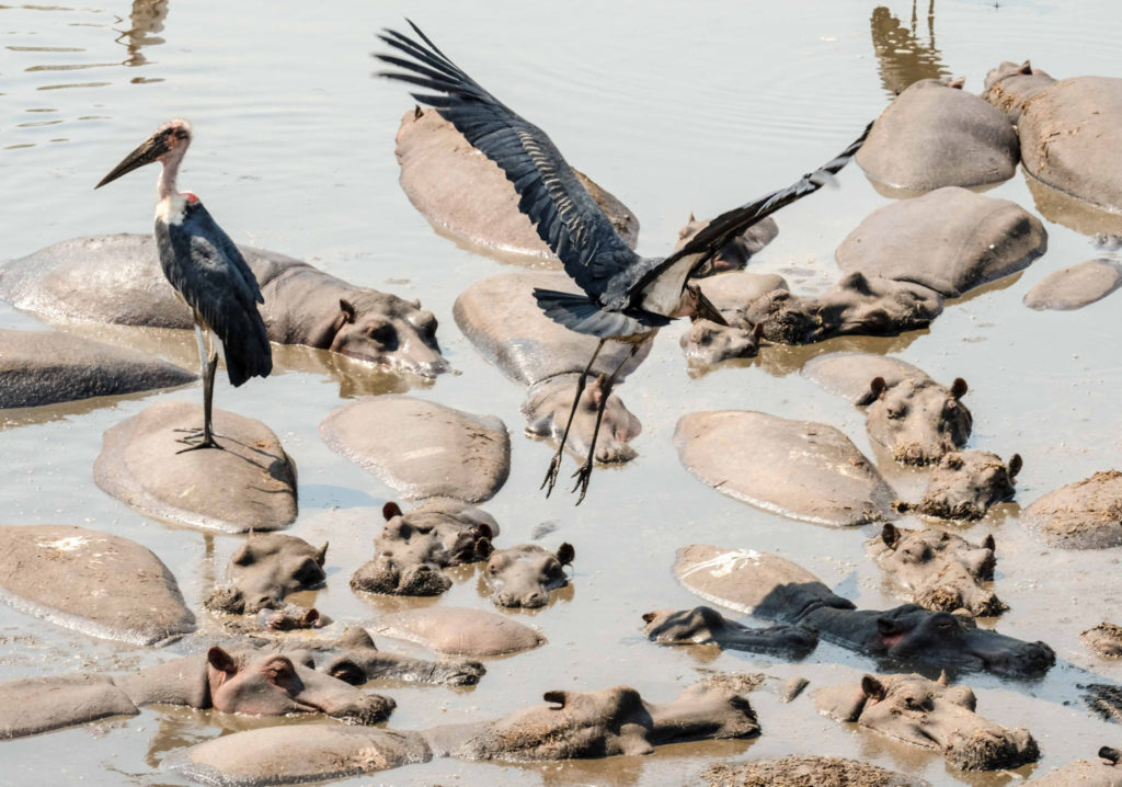 Der 1960 gegründete Manyara ist der einzige Rift-Valley-Nationalpark im Norden Tansanias. Wo in früheren Zeiten die Jeeps von Hardy Krüger und John Wayne über die Ebenen rund um den See rasten, um für den Dreh des Hollywood-Klassikers „Hatari“ Tiere einzufangen. Mehr als zwei Drittel des Parks werden von dem 950 m hoch gelegenen, abflusslosen See eingenommen, der Heerscharen von rosa schimmernden Flamingos Heimat ist. Wir haben wieder eine Special Campsite direkt am See. Pelikane, Marabus, im Hintergrund Gnus, Zebraherden aber auch Giraffen lassen uns die Wunder der Natur bestaunen. Wir sind ganz im Glück. Es gibt einen Hippopool, auch hier gesellen sich zu den Hippos Unmengen von Vögeln.