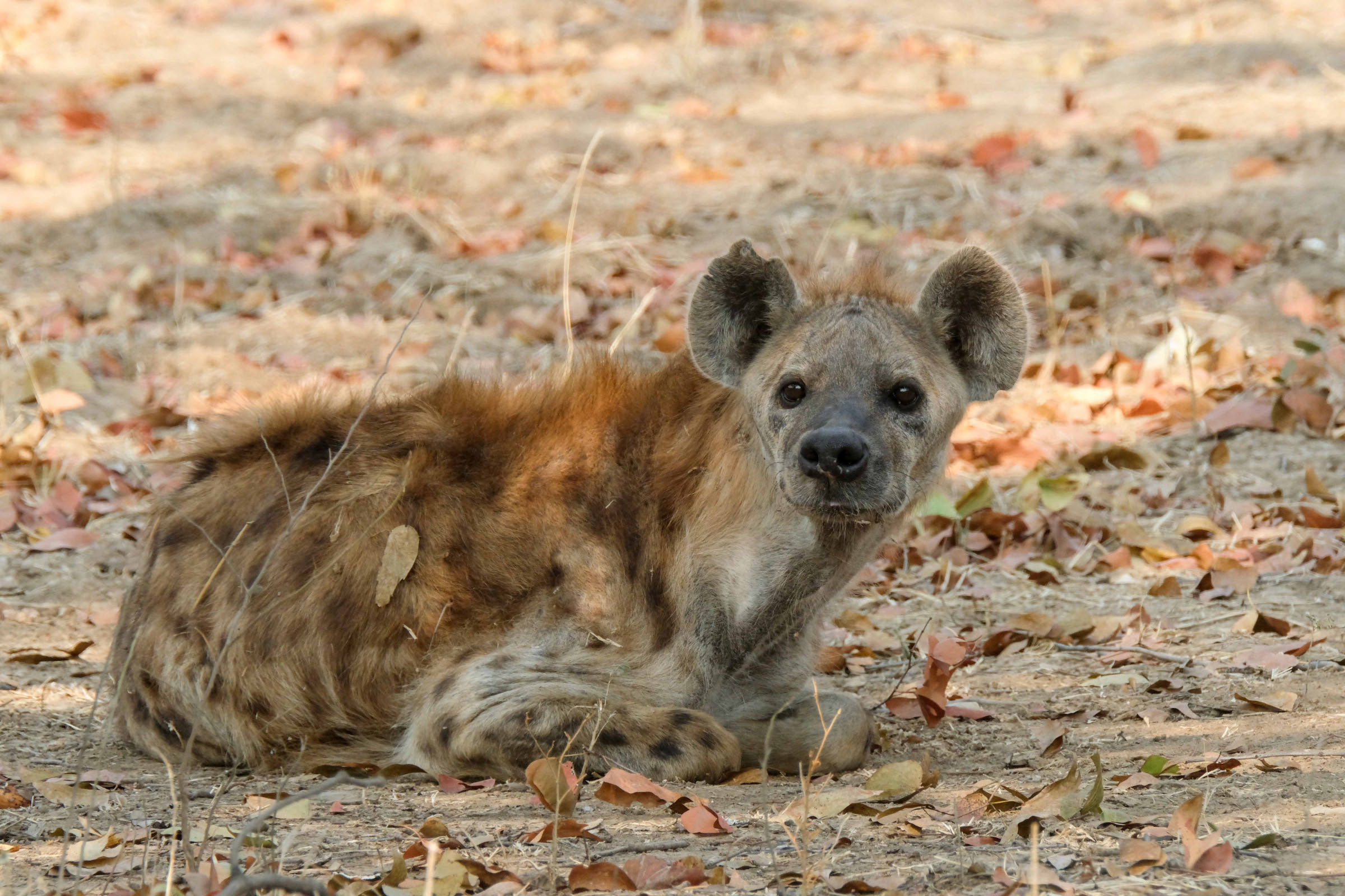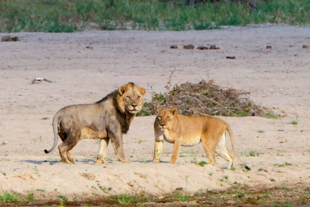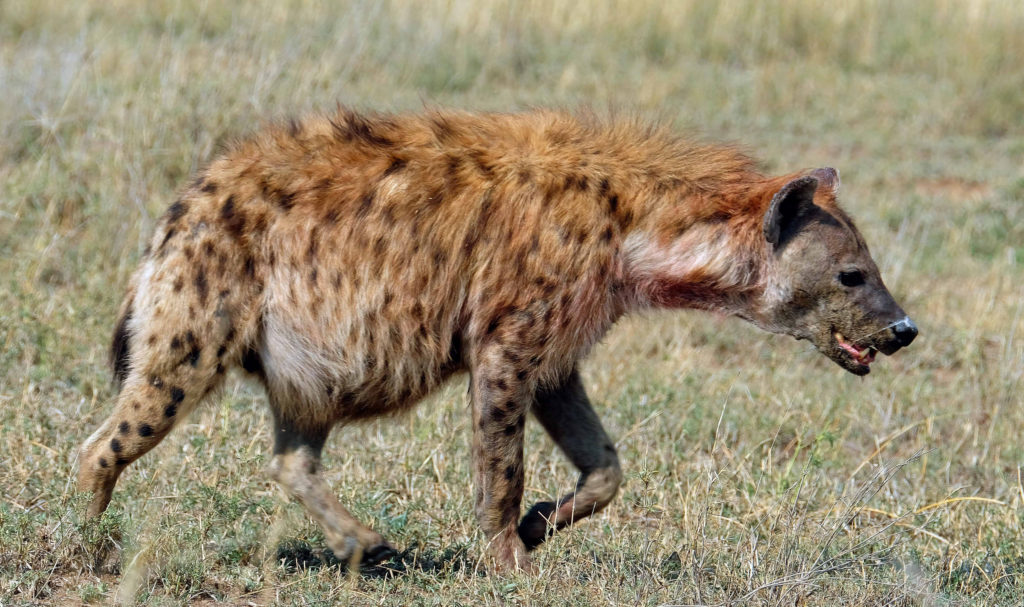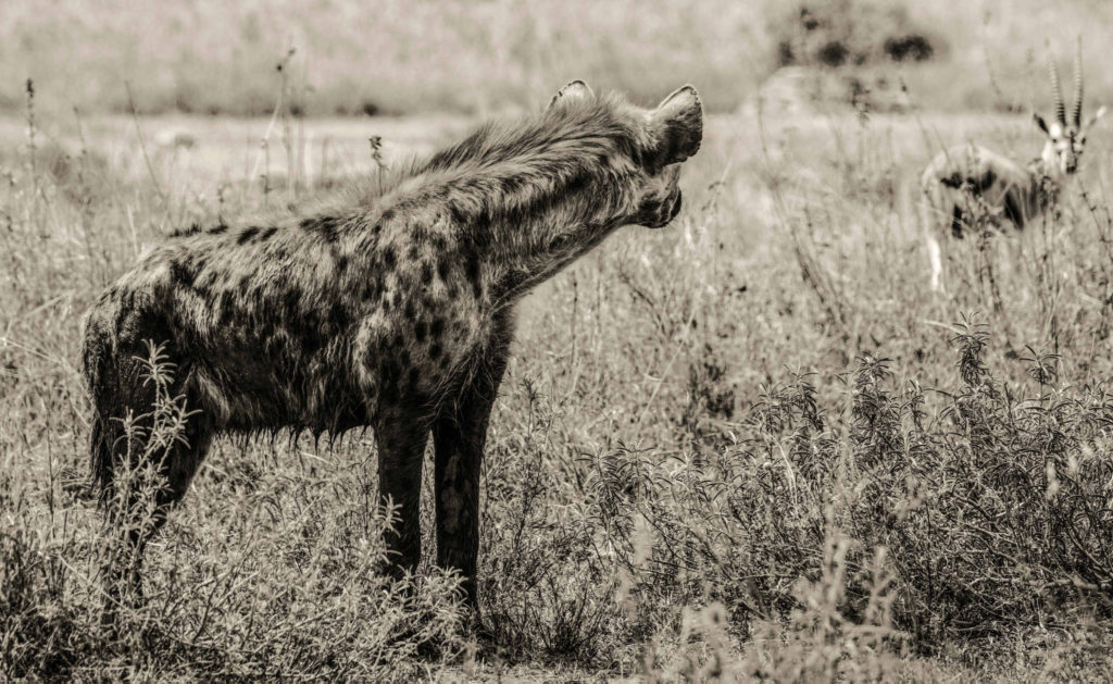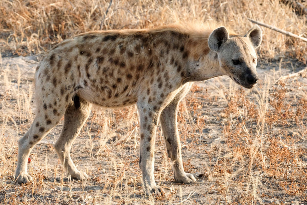 Noch von den Eindrücken des Tages berauscht, sitzen wir abends auf unserer Specials Campsite und planen unsere Weiterfahrt, als ein Safariauto uns darauf aufmerksam macht, dass 300 m entfernt von uns Löwen liegen. Wir suchen sofort Schutz im Auto. Feuer hatten wir noch keines angezündet, weil es noch hell war, was sollen wir also machen. Wir sehen, dass zwei Löwinnen uns beobachten, wissen aber nicht ob noch mehr Löwen in der Nähe sind. Wir entschließen uns zum nächsten Rangerposten zu fahren um uns Hilfe zu holen, was gar nicht so einfach war, weil wir das Dachzelt schon aufgebaut hatten. Irgendwie bekommt Klaus das Zelt zusammengeklappt und wir fahren los. Den Ranger treffen wir leider nicht an, Hotelzimmer sind alle ausgebucht und wir müssen in einem ganz einfachen Hostel übernachten. Wieder erleben wir sehr freundliche hilfsbereite Menschen die noch nicht einmal Geld von uns für die Unterkunft möchten. Am nächsten Morgen geht es dann zurück auf unsere Campsite. Eine Hyäne hat sich an meine Reisetasche gemacht. Der Schaden hält sich aber in Grenzen, die Medikamentenbox ist kaputt und ein Shirt. In der ausführlichen Aufarbeitung des Geschehens kamen wir zu dem Ergebnis, dass wir es durchaus hätten schaffen können das Auto vor die Feuerstelle zu platzieren und dann anzumachen, aber wir sind ja noch lern- und bildungsfähig. Wahrscheinlich war es aber doch klug auf die sichere Seite zu gehen.