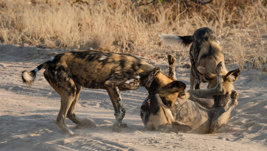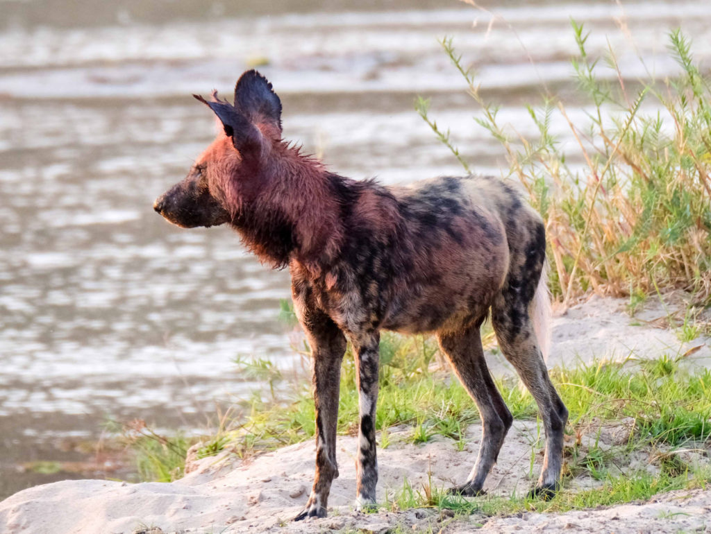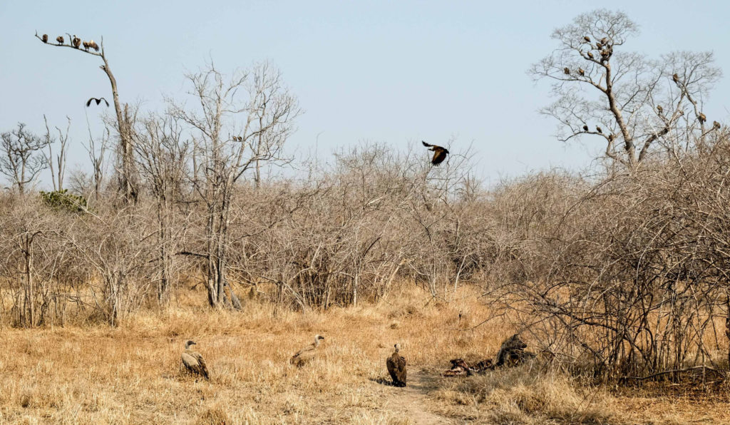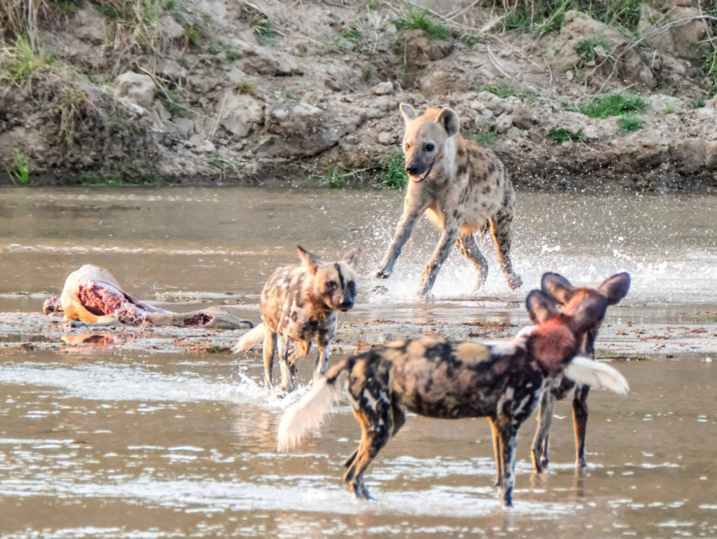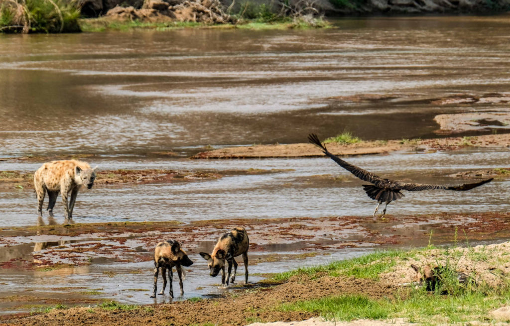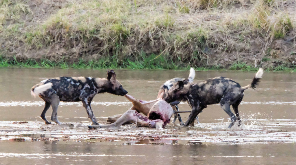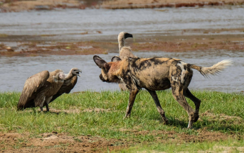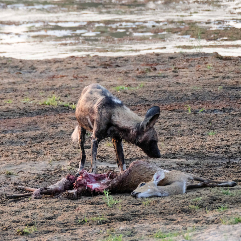 Morgens um 6 Uhr geht es raus. Nicht weit vom Camp am Fluss vertilgen ein Rudel afrikanischer Wildhunde die Reste ihrer Kills aus der Nacht. Hyänen vertreiben sie dann und futtern den Rest. Die Geier bekommen auch noch etwas ab, ein Fischadler zieht darüber seine Kreise.