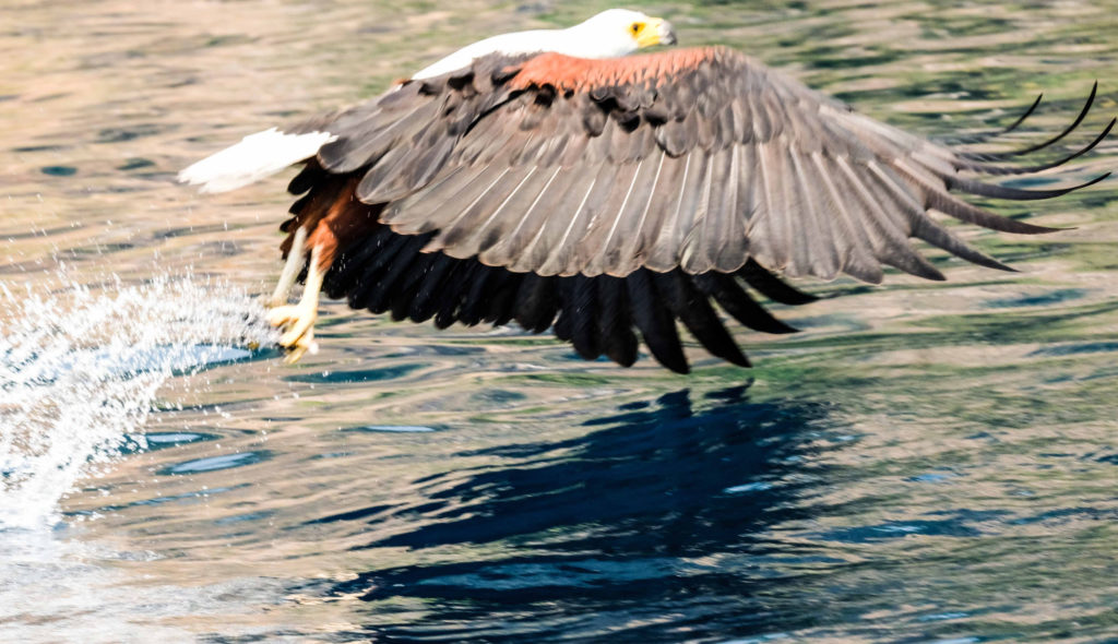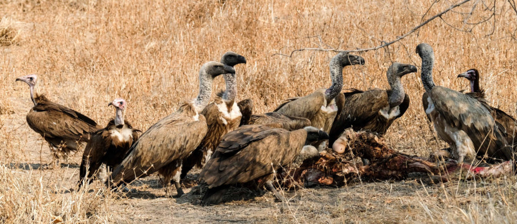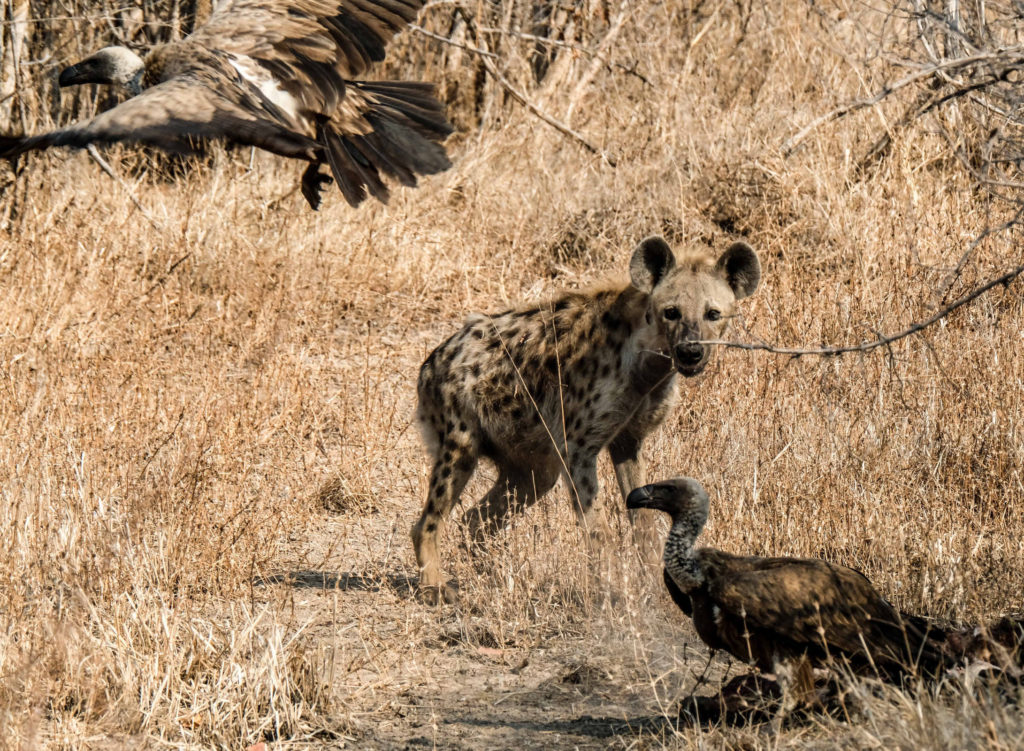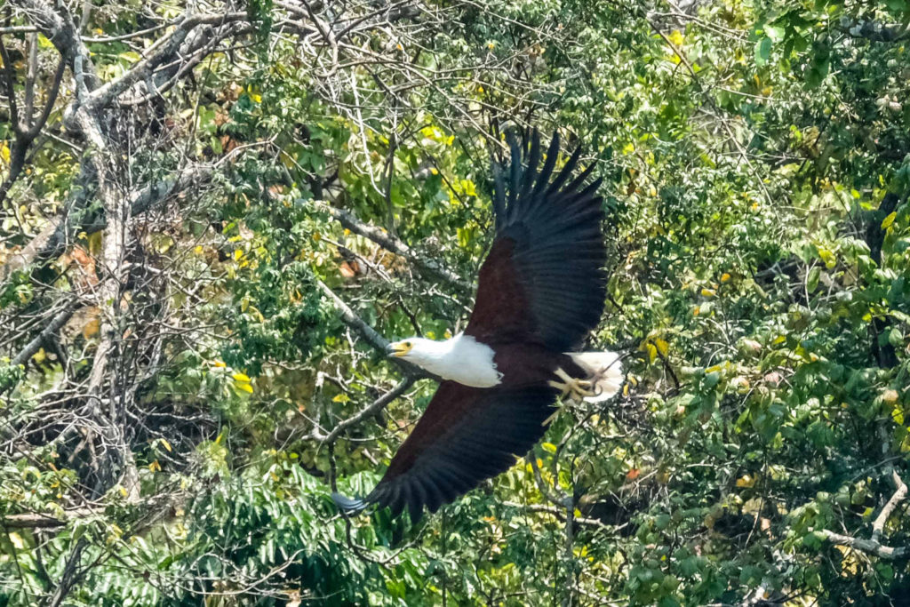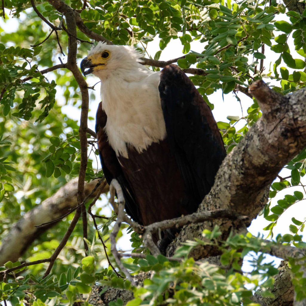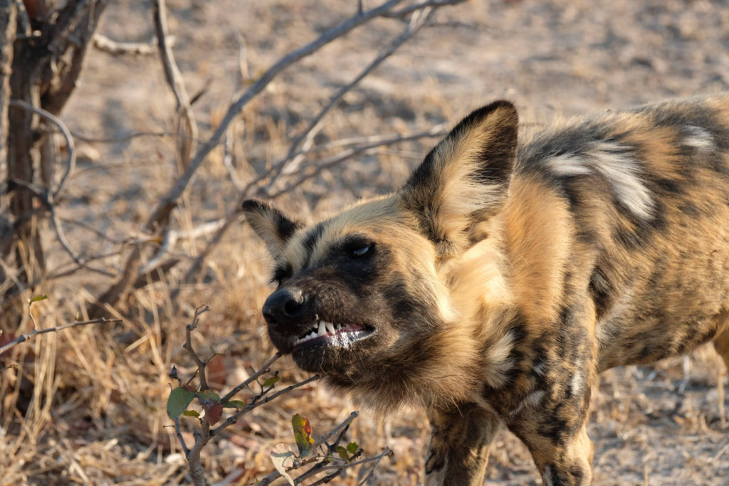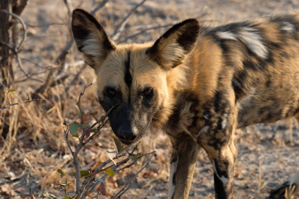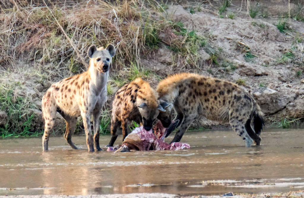 Morgens um 6 Uhr geht es raus. Nicht weit vom Camp am Fluss vertilgen ein Rudel afrikanischer Wildhunde die Reste ihrer Kills aus der Nacht. Hyänen vertreiben sie dann und futtern den Rest. Die Geier bekommen auch noch etwas ab, ein Fischadler zieht darüber seine Kreise.