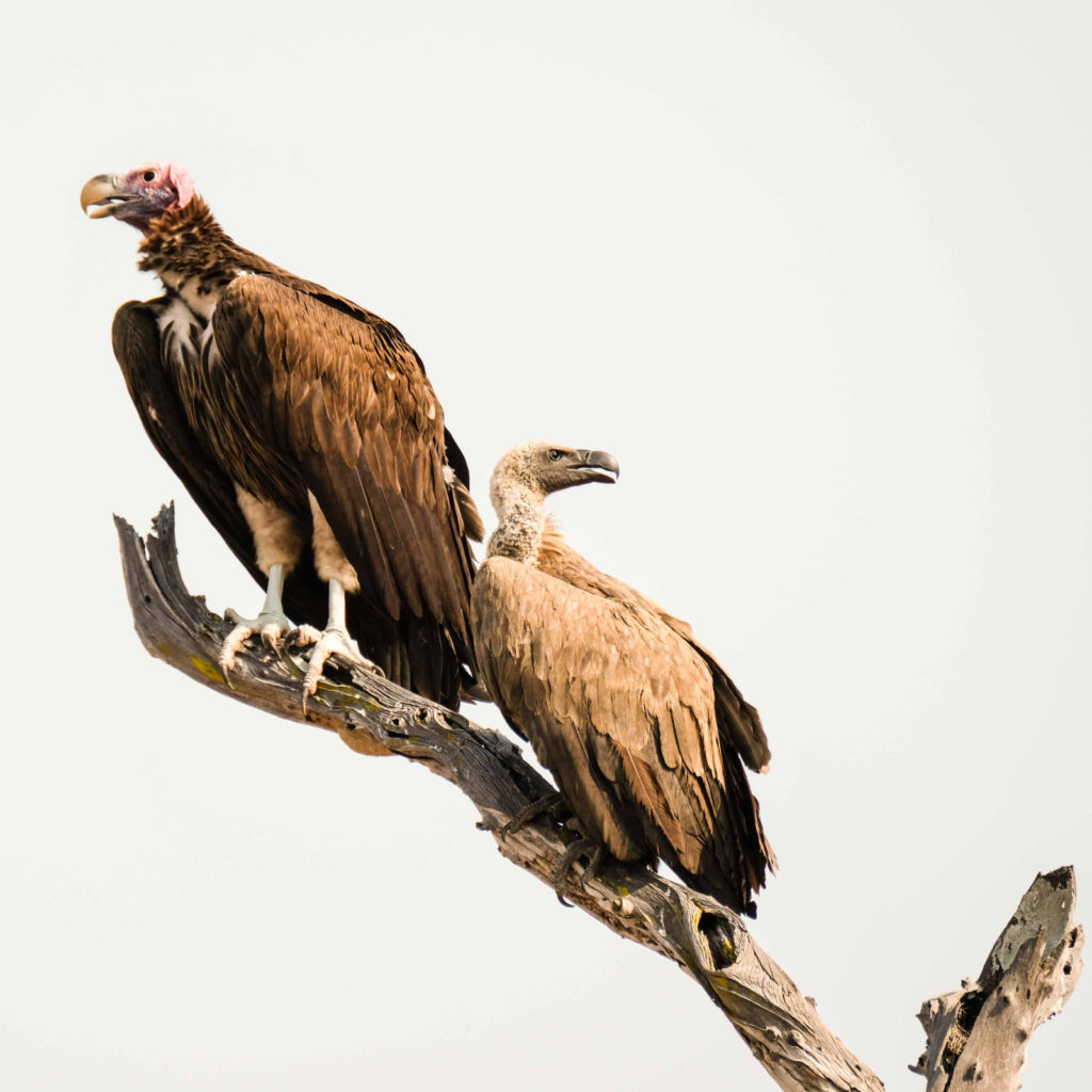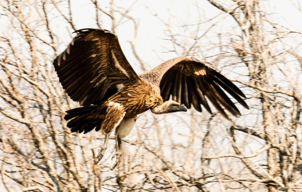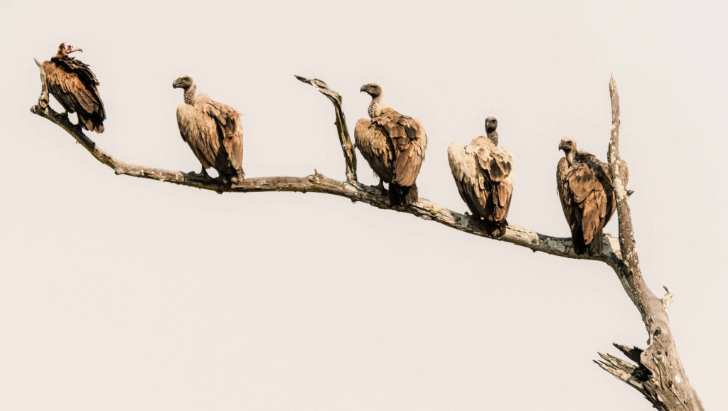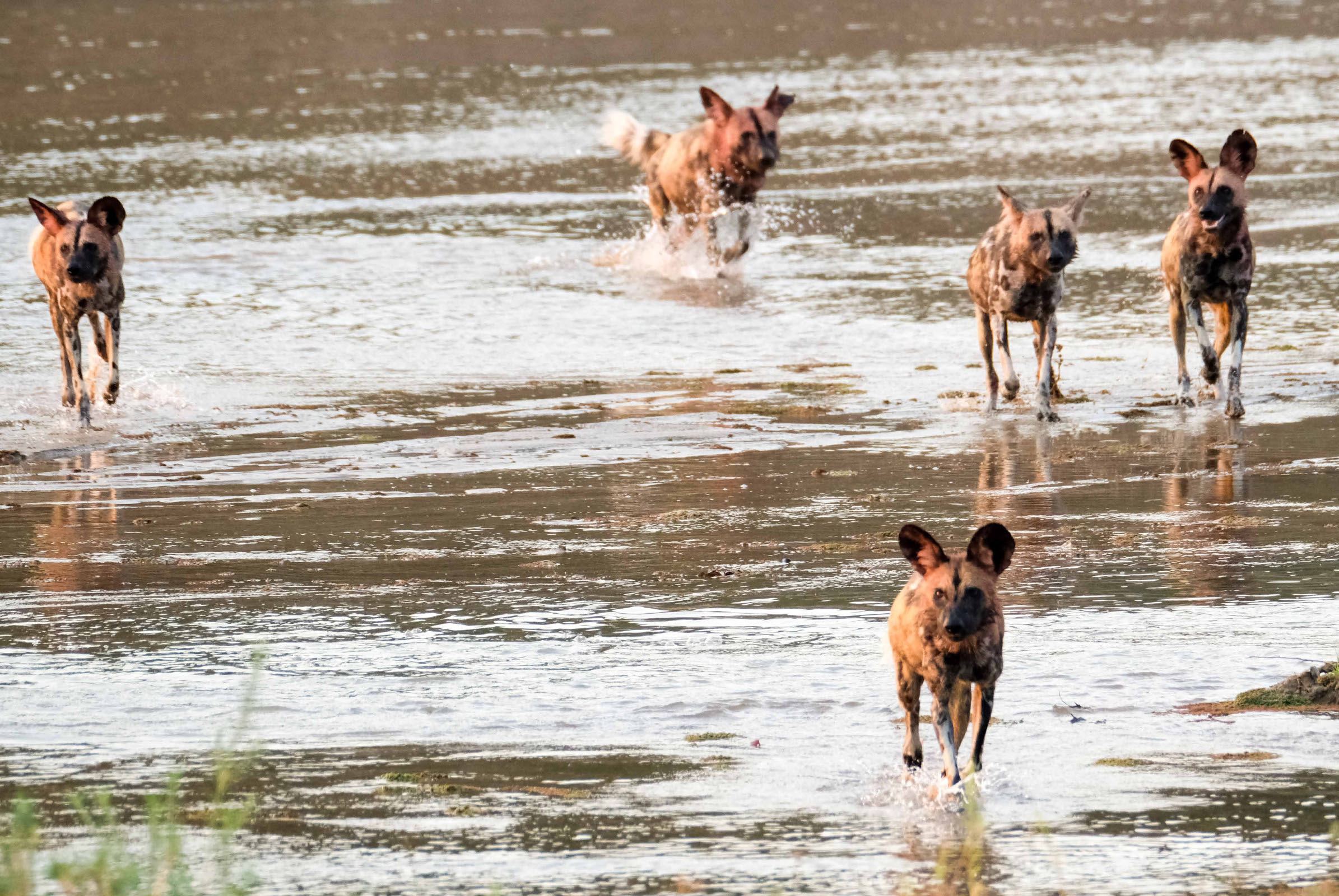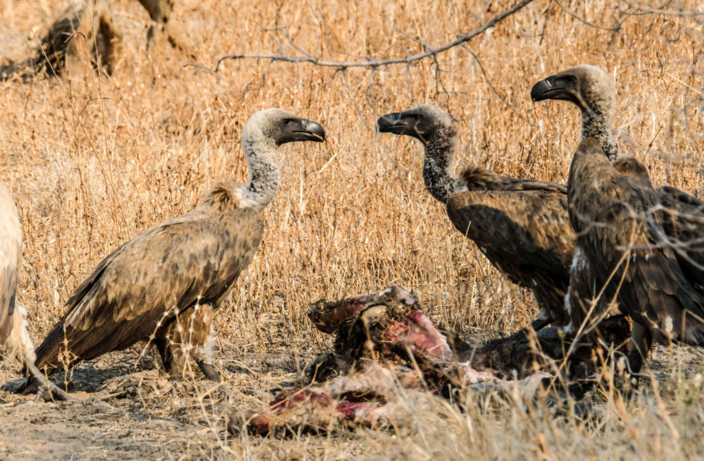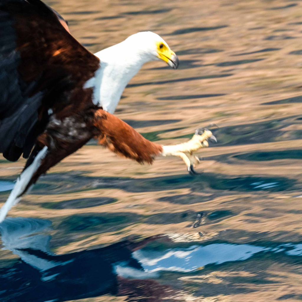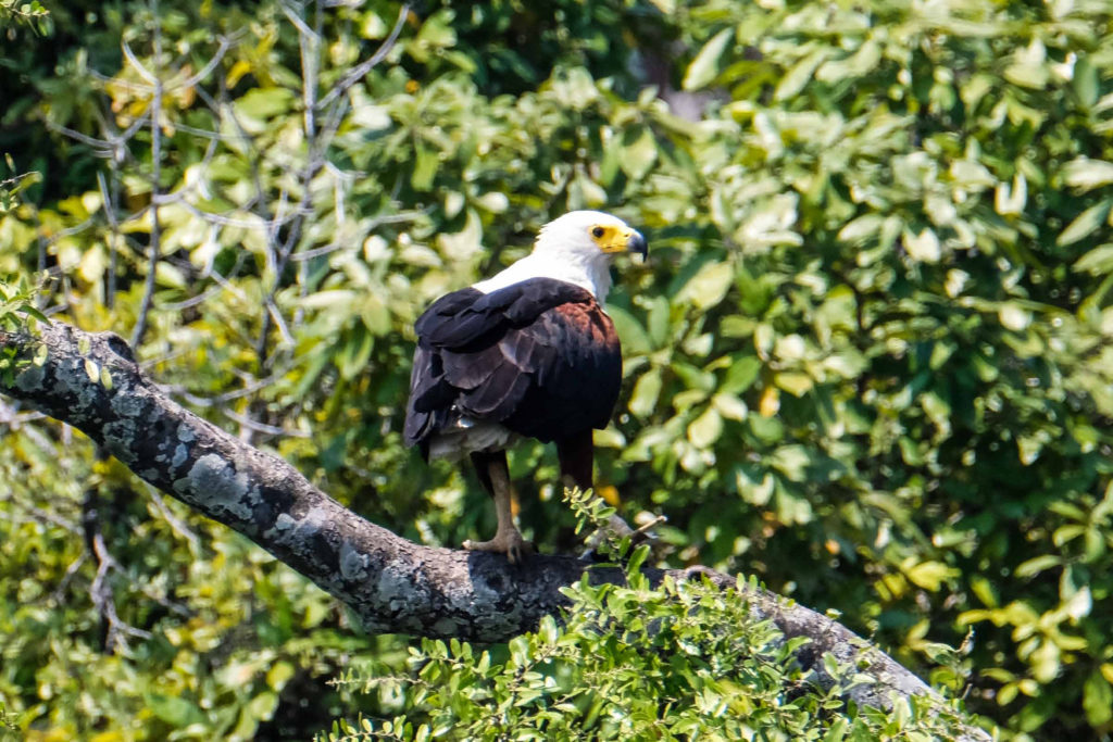 Morgens um 6 Uhr geht es raus. Nicht weit vom Camp am Fluss vertilgen ein Rudel afrikanischer Wildhunde die Reste ihrer Kills aus der Nacht. Hyänen vertreiben sie dann und futtern den Rest. Die Geier bekommen auch noch etwas ab, ein Fischadler zieht darüber seine Kreise.
