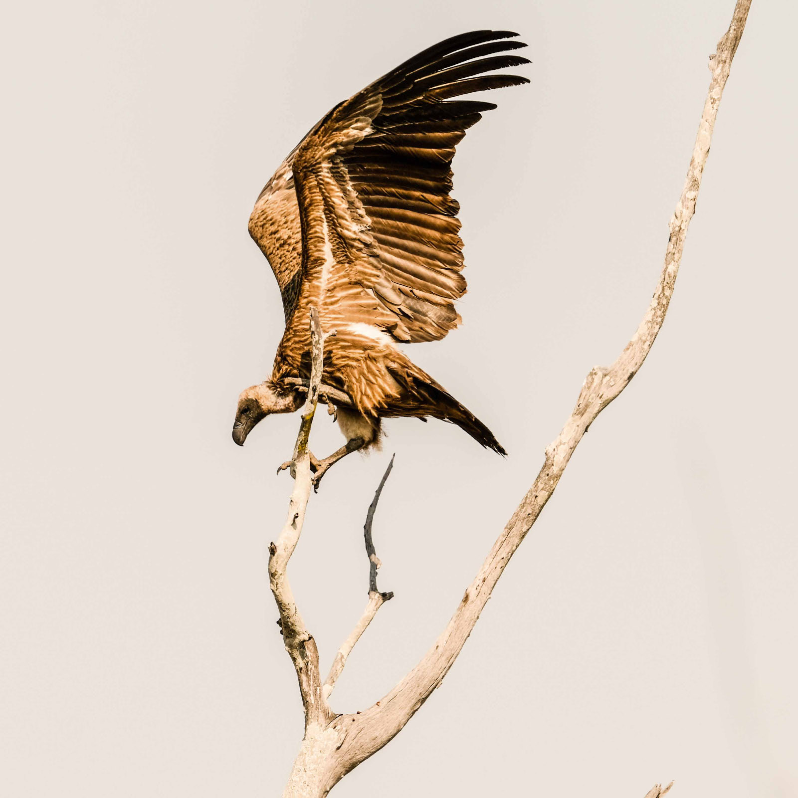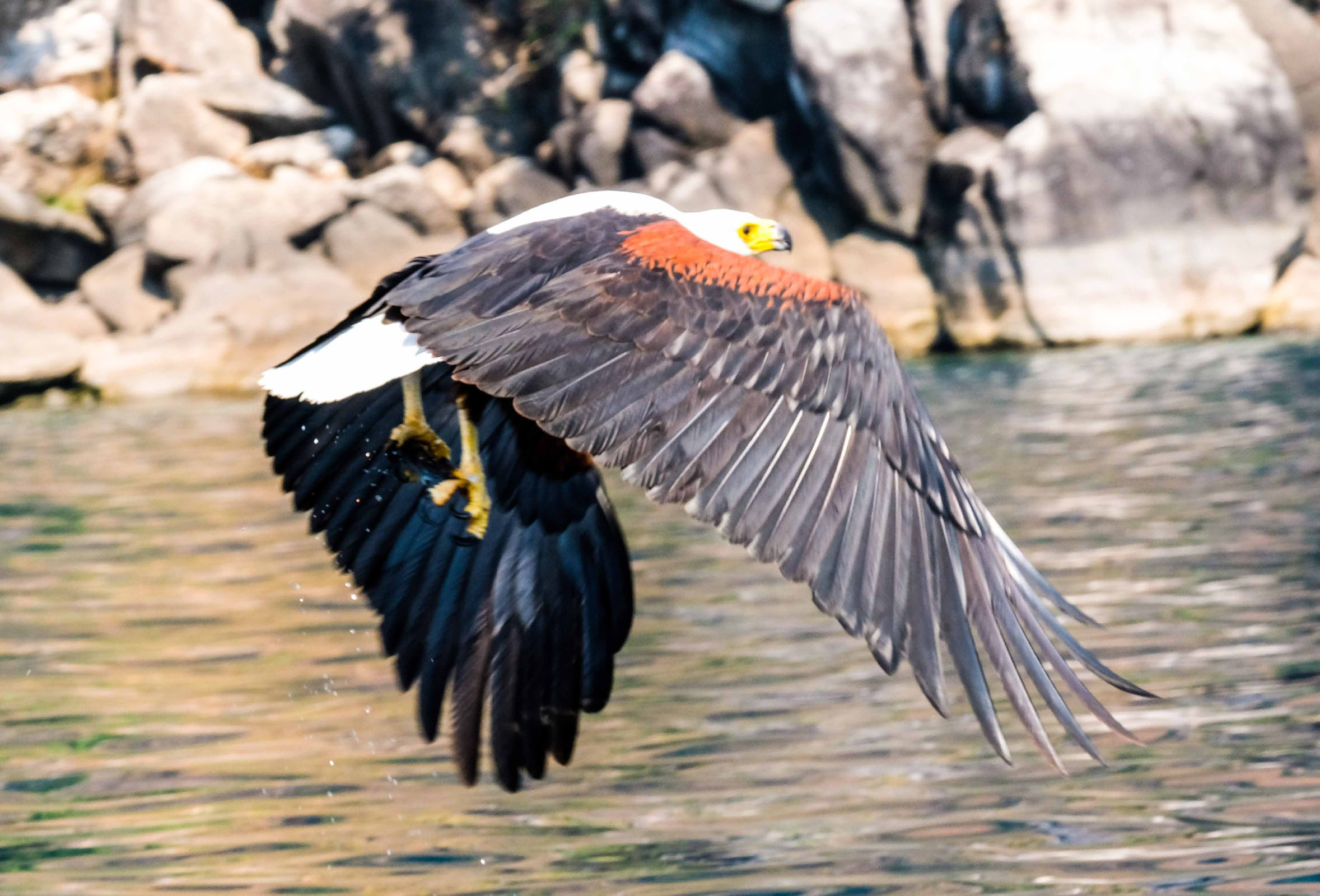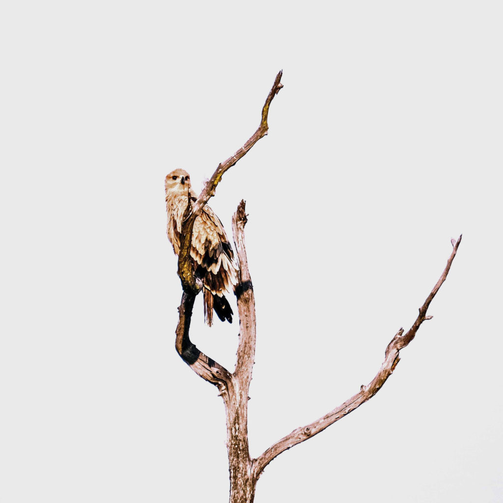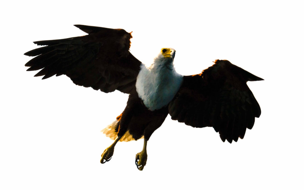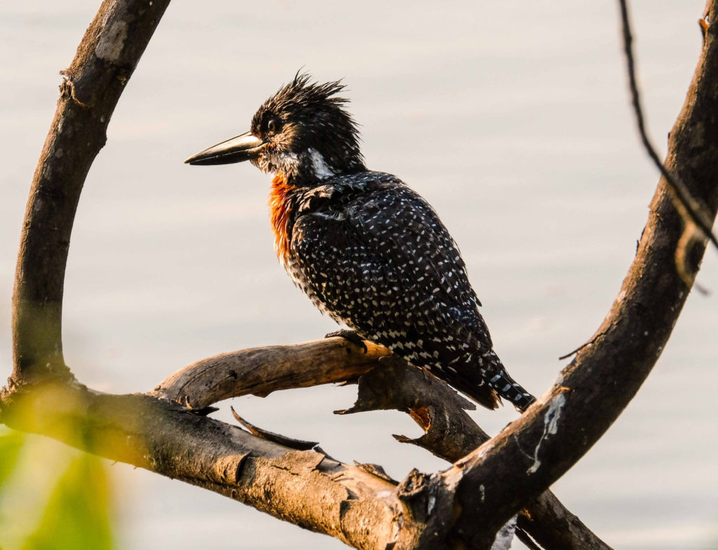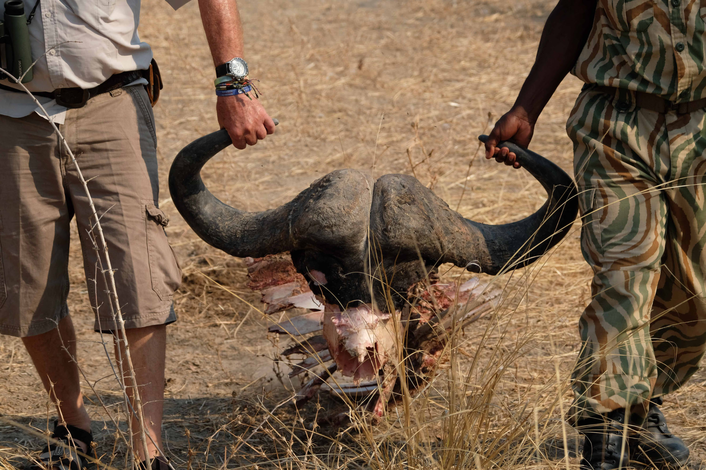 Morgens um 6 Uhr geht es raus. Nicht weit vom Camp am Fluss vertilgen ein Rudel afrikanischer Wildhunde die Reste ihrer Kills aus der Nacht. Hyänen vertreiben sie dann und futtern den Rest. Die Geier bekommen auch noch etwas ab, ein Fischadler zieht darüber seine Kreise.