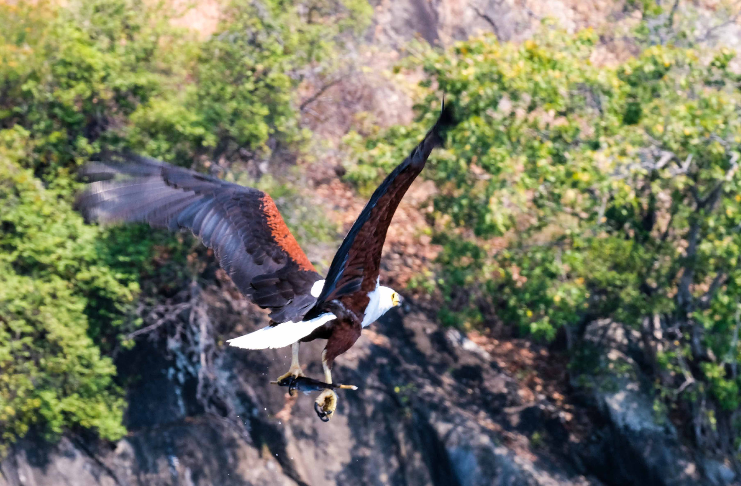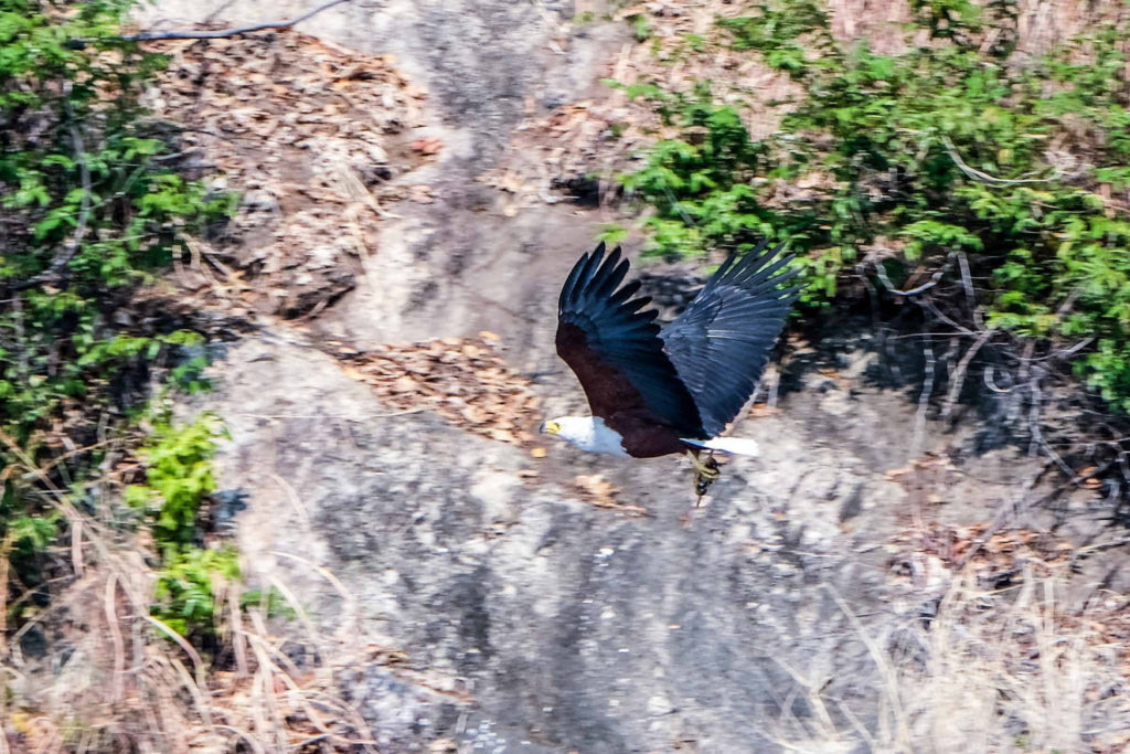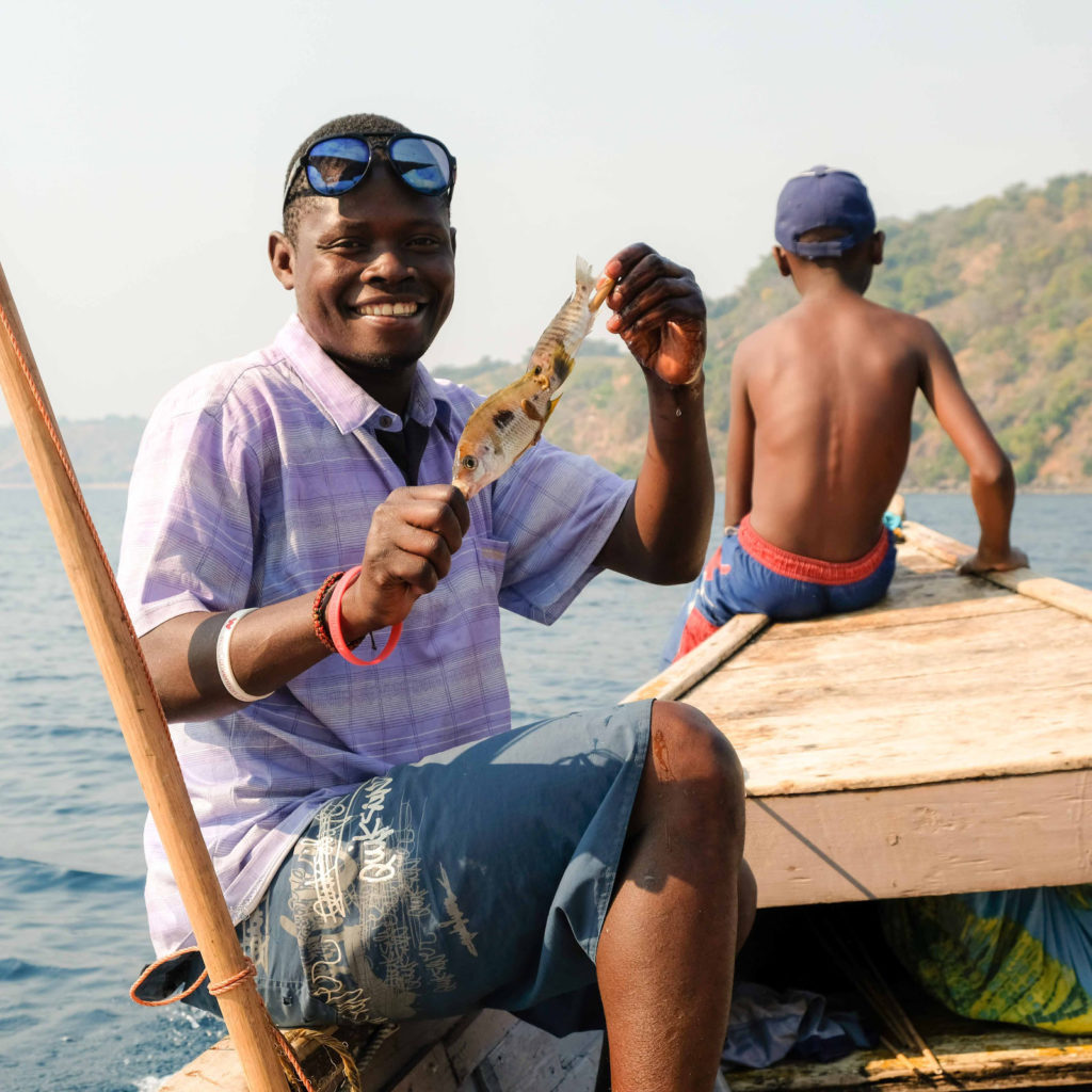 Wir machen einen schönen Bootsausflug. Unser Guide fährt mit dem Boot zu einem Fischer, der gerade auf dem See angelt und kauft ihm ein paar Fische ab, die er dann auf kleine Bambusstöcke spießt. Mit diesen Fischspießen lockt er später zwei Fischadler an, die an einem hohen Hang auf Bäumen sitzen, herunter stürzen und sich die Fischspieße schnappen. Wir fahren in eine kleine Bucht zum schnorcheln und lassen uns zeigen wie man die kleinen Fische ißt, die eine Malawierin gerade über einem kleinen Feuer am Strand gegrillt hat.