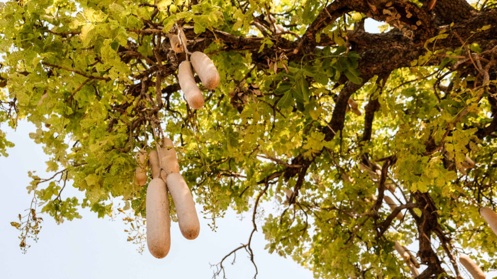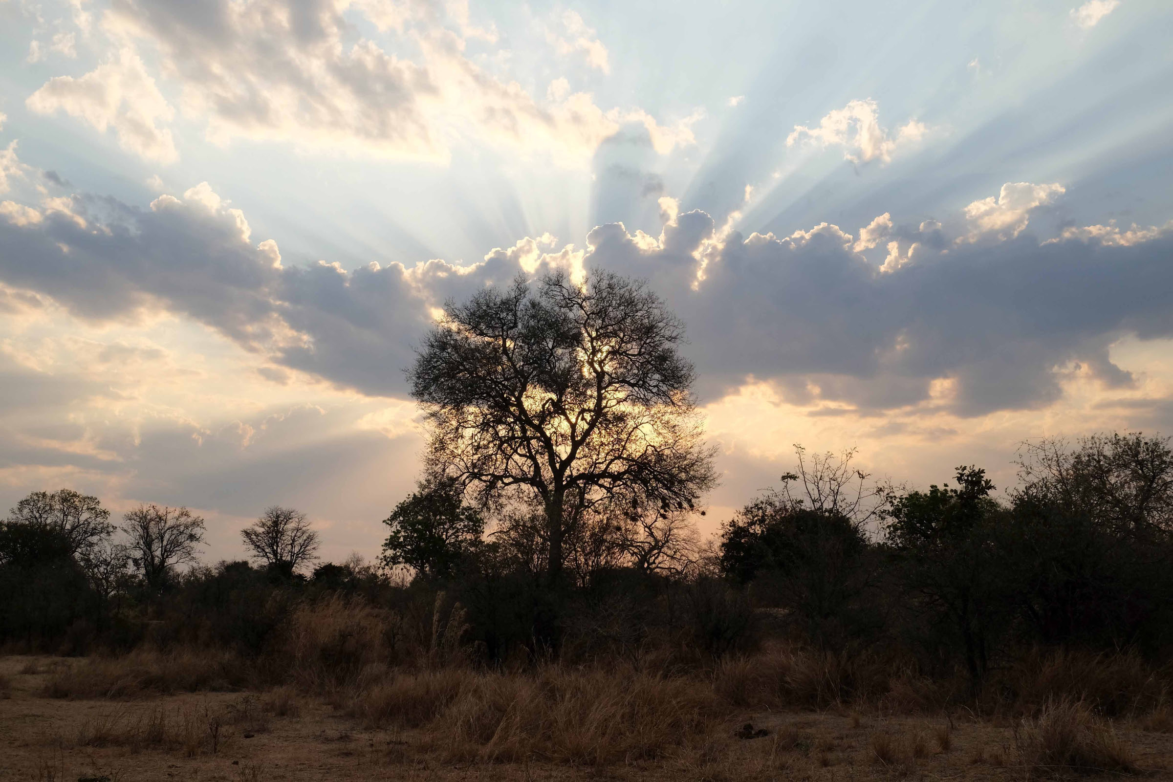 Am Nachmittag machen wir einen Walk. Marc zeigt uns eine Ardvakhöhle, erklärt, dass man die Tiere nur selten sieht, weil sie unglaublich gut hören können und in ihren zahlreichen Höhlen schnell verschwinden. Die Höhlen werden, wenn sie nicht mehr vom Ardvak genutzt werden, von anderen Tieren, leider auch von Wilderern benutzt. Die Früchte vom Leberwurstbaum haben heilende Wirkung, wenn man sie auf eine Wunde streicht und werden gerne von Hippos und Elefanten gefressen. Den Sonnenuntergang bewundern wir noch mit einem Gin Tonic. Alles wurde eigens dazu in Kühlbehältern mitgebracht.