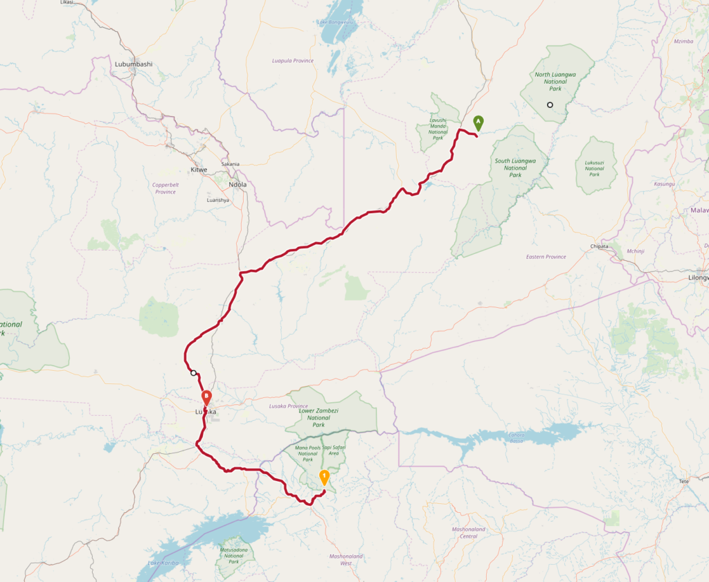 Gegen Ende nach Zambia, einem kleinen Abstechen nach Zimbabwe in den Bergregenwald. Von Zambia in Lusaka geht’s dann wieder mit dem Flieger nach Hause.
