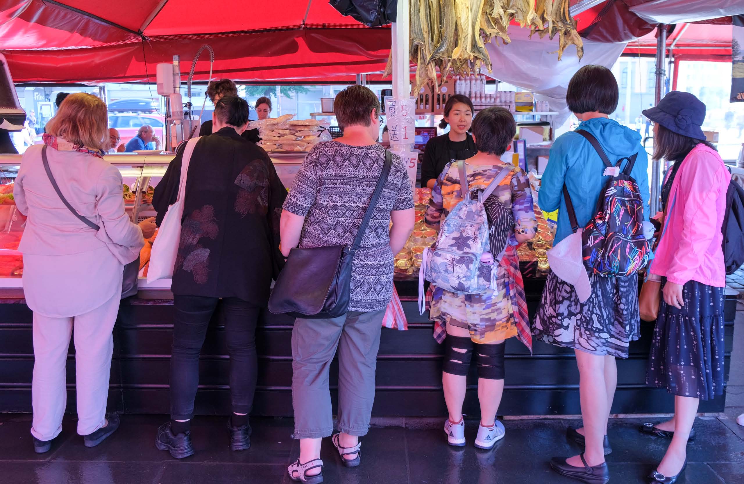 Das ist nun eine sehr spezielle Seite von Norwegen: das einzige öffentliche WC in Bergen – wo wir finden konnten – war am Ende des größeren Hafengebäudes am Fischmarkt. Nach drei sehr hochpreisigen Restaurants ohne Restrooms (!) kommt das offizielle WC – siehe unten. Bedienung geht nur (!) nach der Bezahlung einer Fee mit VISA-Card (und sonst gibt es keine andere Option). Dafür darf man mit vielen Kreuzfahrertouristen aus vielen Ländern lange in einer langen Schlange stehen, um endlich auf ein ungepflegtes WC zu dürfen. Gastfreundschaft? Wir haben in Norwegen noch einige weitere schwierige Situationen erlebt – aber damit genug..