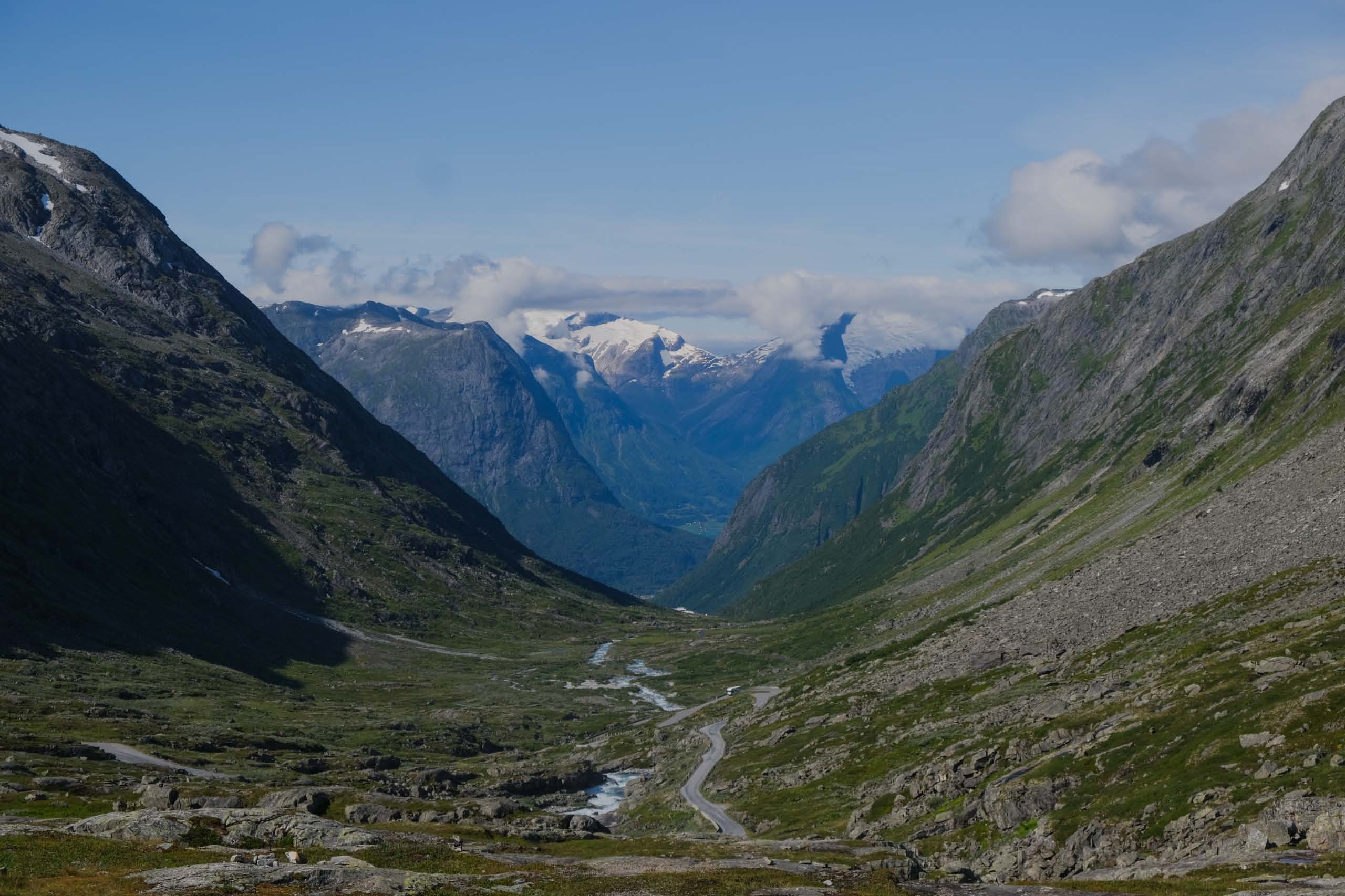 Nach Grotli fahren wir einen kleinen Umweg ins norwegische wildromantische Hochgebirge. Die Straßen sind Teil sehr schmal, dass Begegnungsverkehr nur an den Ausweichbuchten möglich ist.