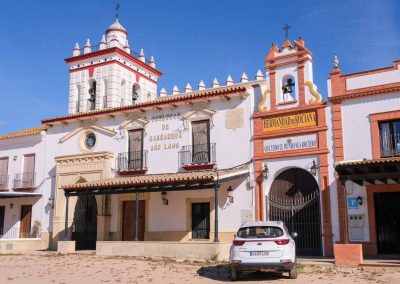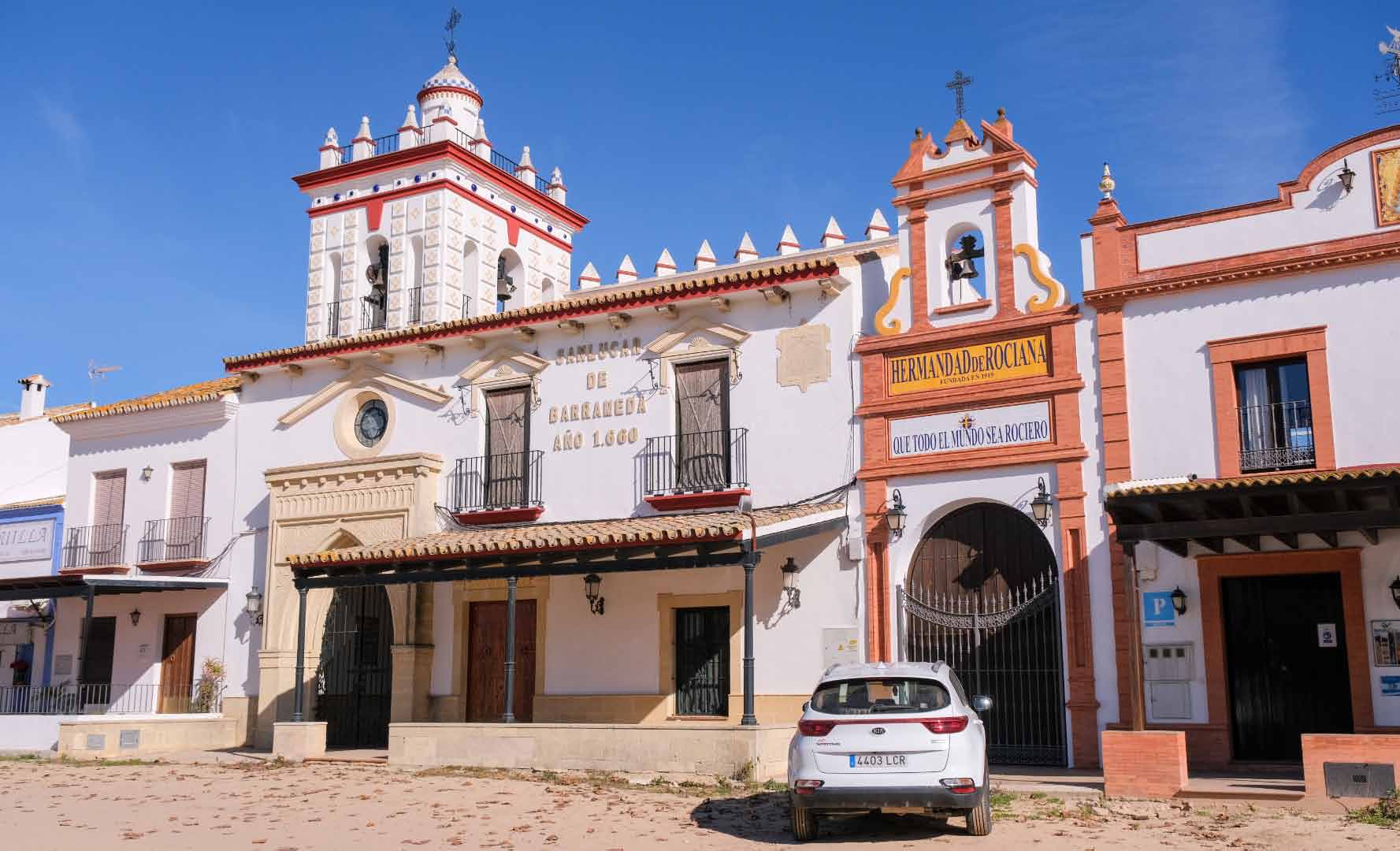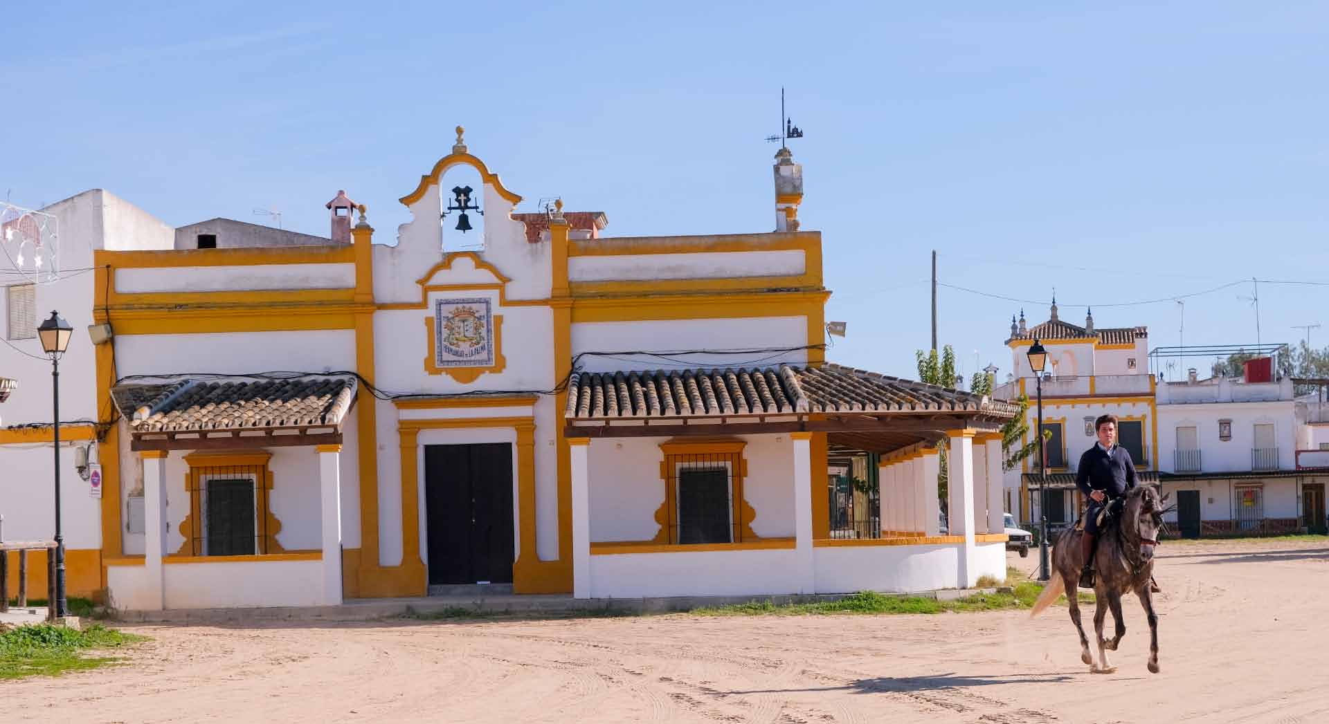 Und dann fahren wir noch ein paar Kilometer mit unserem E-Scooter weiter nach El Rocio. Dies ist ein besonderer Ort – im Normalfall sind dort 800 Einwohner, eine große Kirche und viele Hotels und Bars. Auch gibt es nur unbefestigte Wege / Straßen im gesamten Ort. Dafür sieht man häufig Pferde und Reiter und es erinnert eher an einen Westernort als an einen Ort in Spanien.