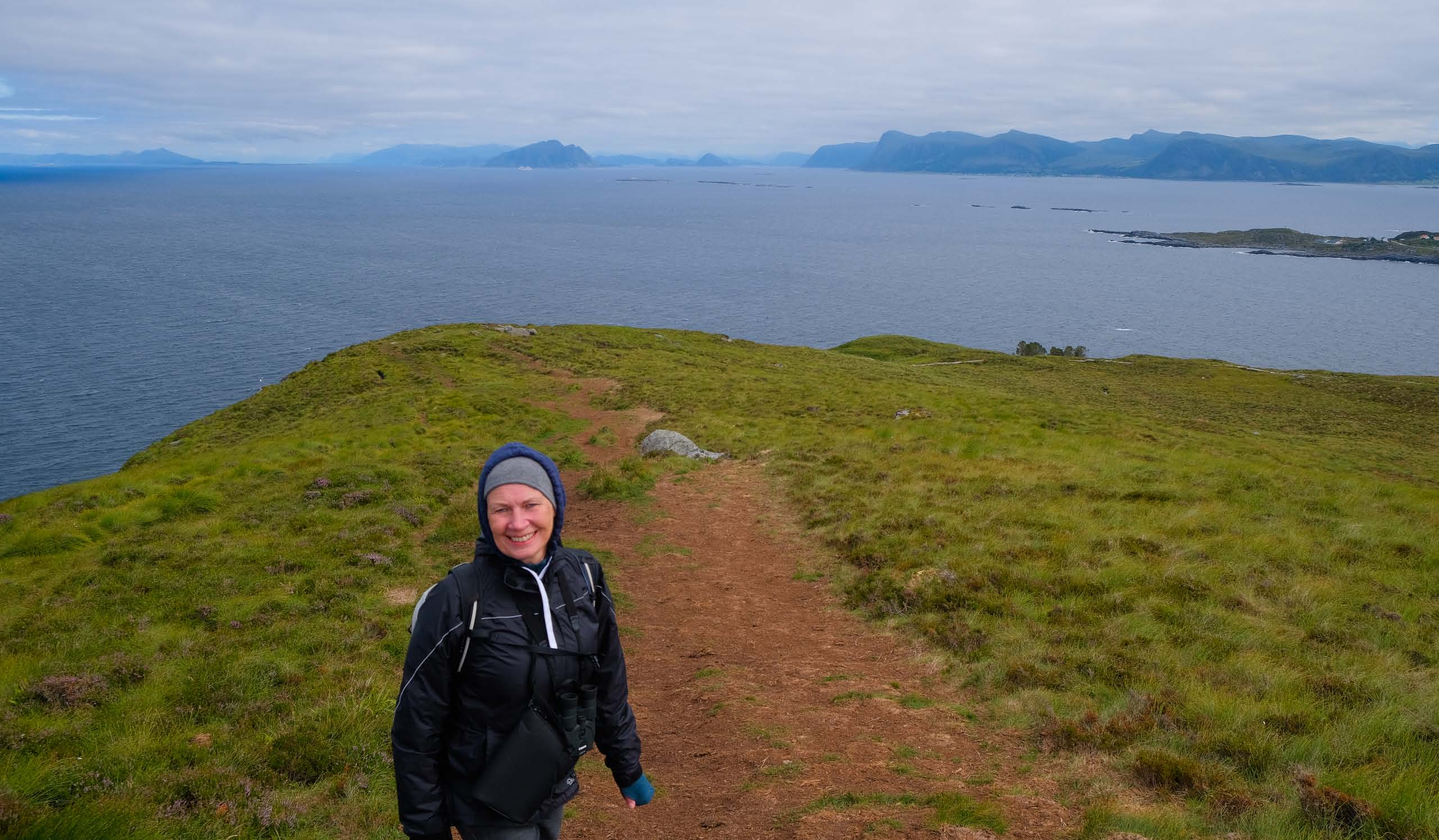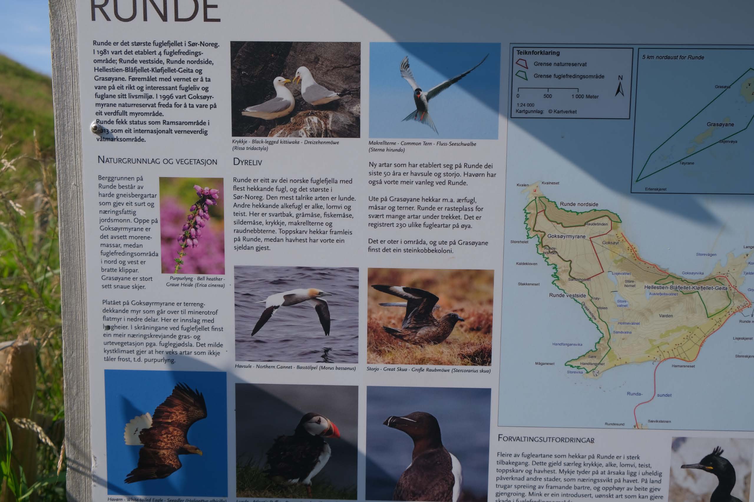 2. und 3. August verbringen wir auf der kleinen Insel Runde mit einer Fläche von 6,4 km2 und nur 150 Menschen leben dort. Die Insel ist ein fast unberührtes Naturschutzgebiet mit hohen Felsen, ideale Brutplätze für 500.000 Seevögel. Z. B. Basstöpel, große Raubmöven und auch einen Seeadler haben wir gesehen. 5 Stunden sind wir gewandert, mit hohen Anstiegen, wunderschönen Aussichten und bei frischem Wind.