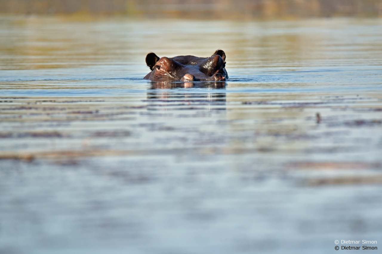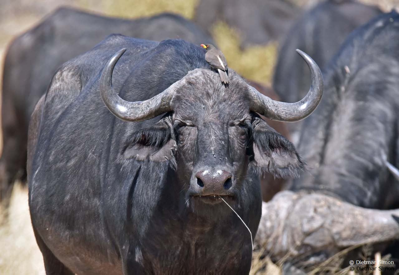 Der zweite Tag mit einer Bootsfahrt – Hippos in ca. 50 m Entfernung, einer tollen Affenbande und vor allem einer riesigen Büffelherde, die uns den geplanten Weg abschneidet und sich so gut wie gar nicht weiterbewegt. Am Abend erfahren wir, dass Löwen einen Büffel erlegt haben und fahren nochmal zu der Stelle – trauen uns jedoch nicht offroad ins Gelände zu fahren und sehen einen Baum voller Geier – in der Nähe des Tat.